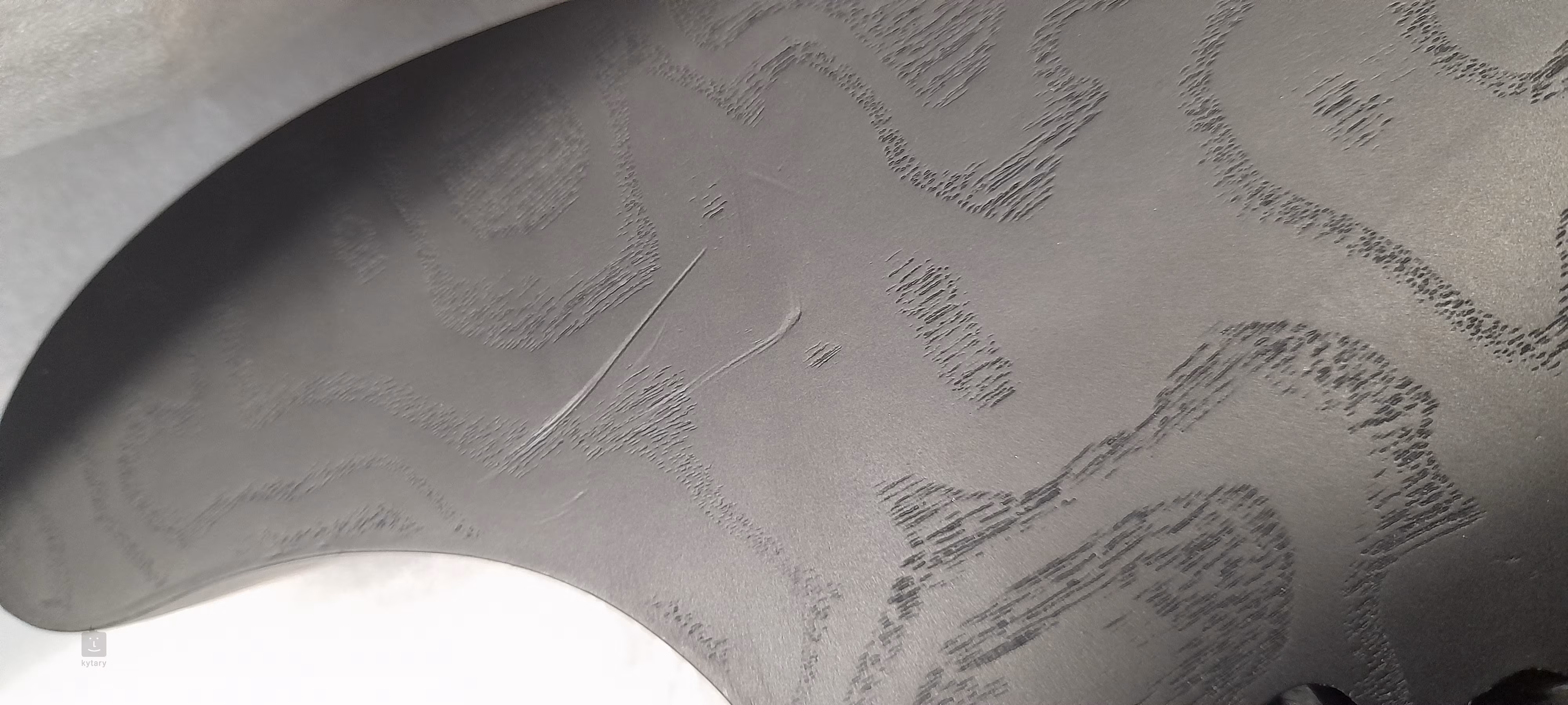 Kytara už na první pohled upoutá kresbou dřeva topu z pískované kořenice jasanu a barevnou úpravou Etched Black. K mahagonovému tělu je přišroubován krk složený z pěti kusů javoru a dřeva purpleheart. Efektní kresbou zaujme i hmatník z ebenu makassar osazený čtyřiadvaceti pražci a pozičními značkami ve tvaru dešťových kapek (raindrop).
