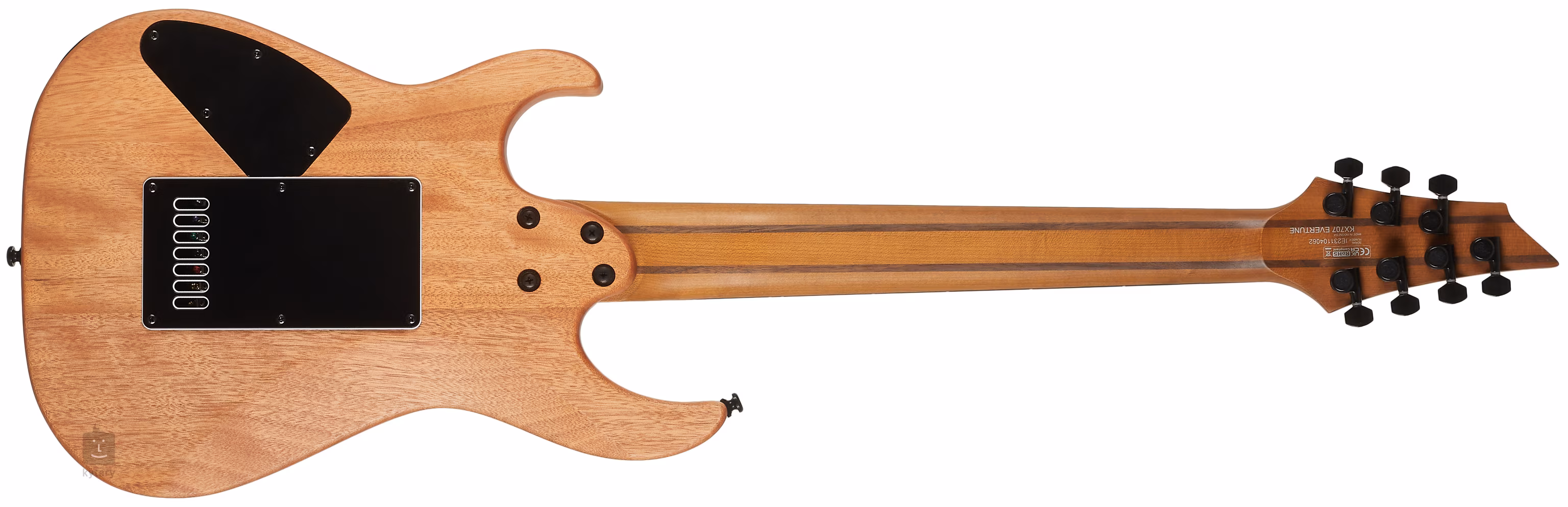 Mahagonové tělo sedmistrunné kytary KX707 EVERTUNE OPBK w/bag zdobí jasanový top a povrchová úprava s otevřenými póry (open pore). Ke krku z pěti kusů javoru a ořechu je přilepen ebenový hmatník osazený čtyřiadvaceti pražci z nerezové oceli. Orientaci na hmatníku i během hraní za šera usnadňují boční luminiscenční tečky (luminlay).