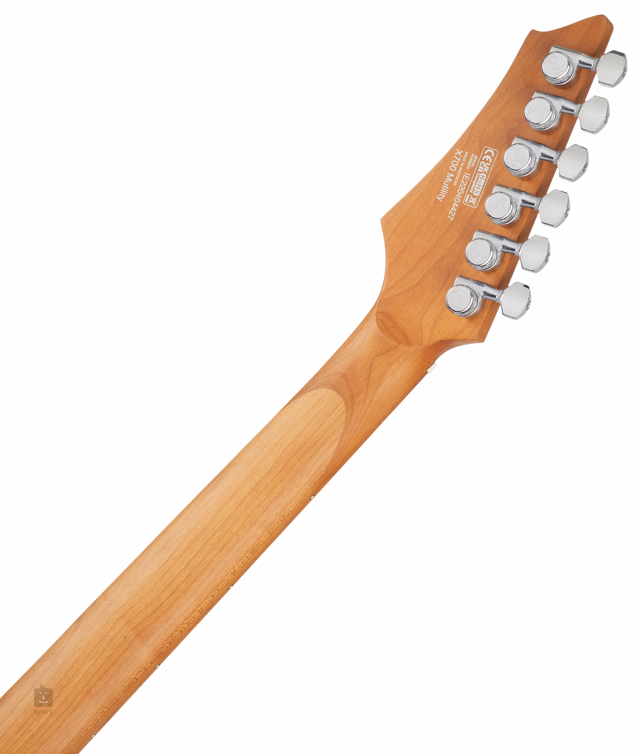Model X700 Mutility BKS je dalším krokem značky Cort směrem k vyšším modelovým řadám s plně profi parametry, který je nutno brát vážně. Kytara už na první pohled upoutá moderním dotaženým designem s efektní vrchní dýhou z javoru a jasanu na mahagonovém těle. Hlubší výřezy těla (belly cut a výřez spodního rohu) poskytují hráčům maximální herní komfort.