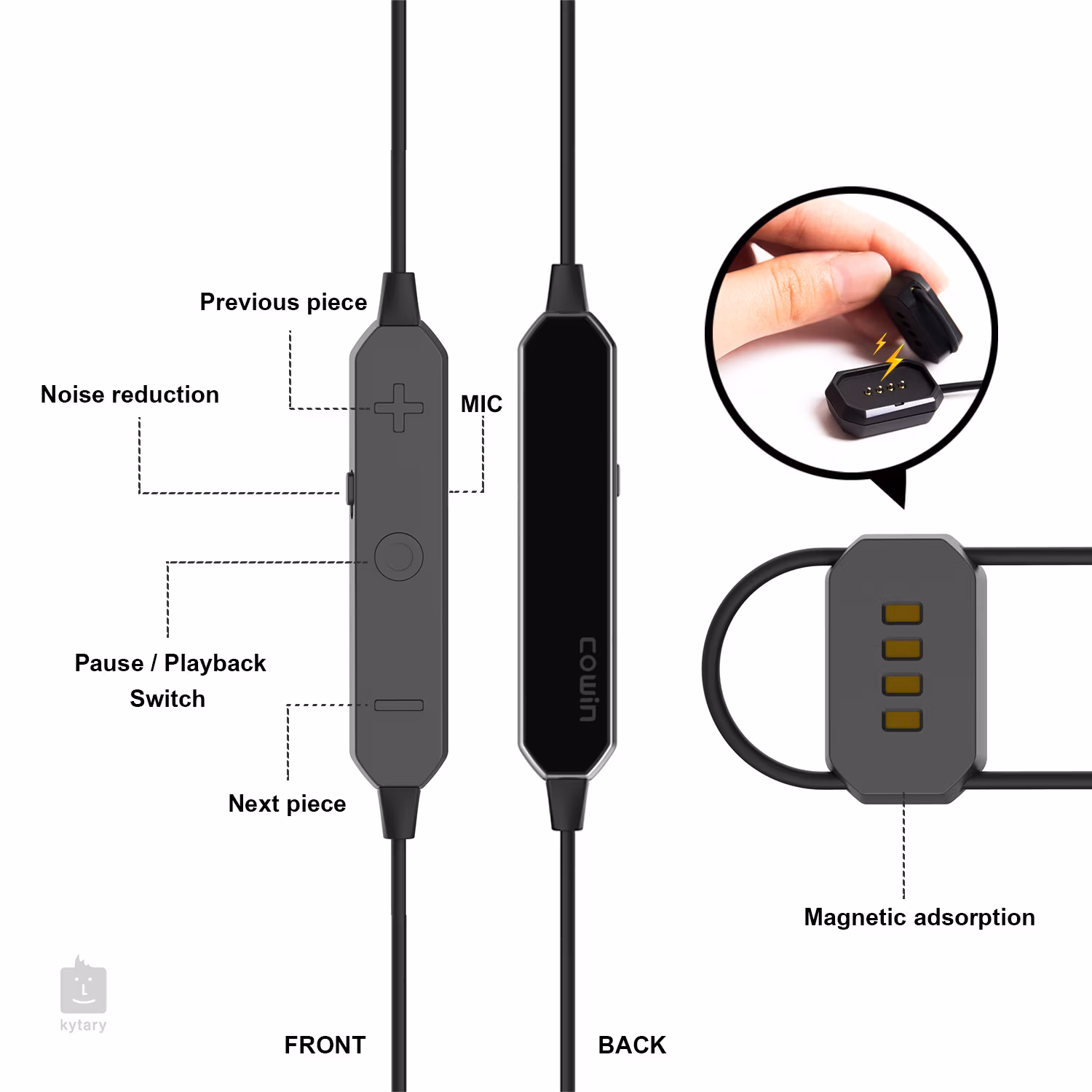 Součástí balení jsou dva páry náhradních špuntů různých velikostí, takže vám perfektně padnou do uší. Díky aktivnímu rušení šumu k vám pustí jen to, co si sami přejete, ať už sedíte v kanceláři, rušné kavárně nebo jedete autobusem. Sluchátka připojíte k zařízení pomocí bezdrátové technologie Bluetooth 4.0, baterie vydrží na jedno nabití až 5 hodin a po připojení malé powerbanky se doba přehrávání prodlouží až o 10 hodin. Sluchátká mají dále zabudovaný mikrofon pro příjmutí handsfree hovoru a intuitivní třítlačítkový ovládač pro přepínání skladeb nebo změnu hlasitosti.