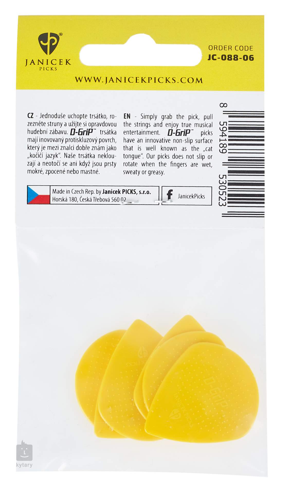 Česká firma Janíček se vývoji trsátek věnuje již od roku 1991 a ze záplavy konkurenčních výrobků vyčnívá jedním podstatným faktorem – vyrábí trsátka, která vám z prstů opravdu nevyklouznou. Speciální povrch D-Grip známý také jako „kočičí jazyk“ je patentově chráněný, a právě díky němu jsou Janíčkova trsátka oblíbená po celém světě.