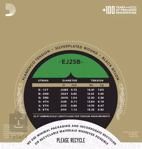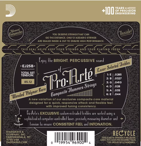 Nylonové struny Pro-Arté EJ25B značky D’Addario jsou profesionální struny pro klasickou kytaru určené pro hráče flamenca. V této sadě najdete tři vysoké struny z černého nylonu, které produkují vřelý, zakulacený tón. K tomu připočtěte tři basové struny, které vám díky inovativnímu kompozitnímu jádru poskytnou silné a průrazné basy. Výsledkem je vyvážená směs vřelého a asertivního zvuku, která si vás podmaní a pohladí na duši. Pnutí strun je přizpůsobené stylu flamenco – poskytuje flexibilitu a zároveň rychlou a silnou odezvu, která je pro flamenco nezbytná.