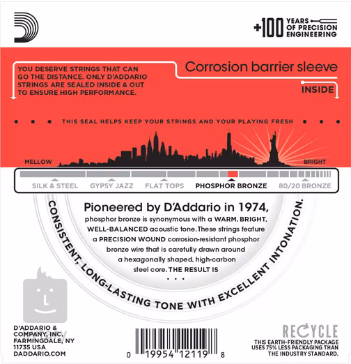 Pokud hledáte struny pro akustickou kytaru se zakulaceným, vřelým zvukem, řada D'Addario Phosphor Bronze pro vás bude tou správnou volbou. Fosforbronz se v dnešní době k výrobě strun používá běžně, ale v roce 1974 to byla právě společnost D'Addario, která tento materiál předvedla úplně poprvé. Od té doby jsou synonymem pro teplý, frekvenčně vyvážený tón, který je vhodný pro všechny možné žánry. Šestihranné ocelové jádro s vysokým obsahem uhlíku jim dodává dlouhou životnost, excelentní intonaci a nádherný tón. V tomto balení najdete struny pro dvanáctistrunnou kytaru tvrdosti 12.