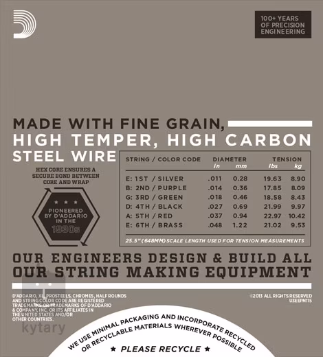 Tloušťky jednotlivých strun: .011/.014/.018/.027/.037/.048