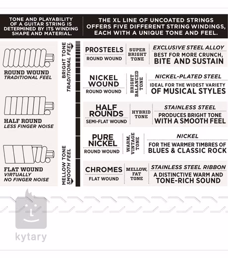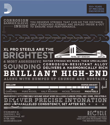 Struny na elektrickou kytaru D’addario XL ProSteels vám nabídnou výjimečně jasný a pronikavý zvuk, který se prosadí v jakémkoliv mixu. Jsou vyrobeny z unikátní, vysoce magnetické ocelové slitiny, která produkuje jasný, nakřáplý tón s dlouhým sustainem. Jejich základem je šestihranné ocelové jádro, které zajišťuje perfektní intonaci, dlouhou životnost a konzistentní pocit ze hry. Vinuté struny jsou potažené drátem z nerezové oceli, která perfektně spolupracuje s magnetickými snímači a poskytuje tak neuvěřitelně průrazný tón. Ideální na koncerty i do studia.