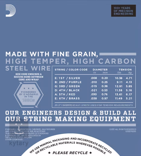 Tloušťky jednotlivých strun: .008/.010/.015/.021/.030/.038