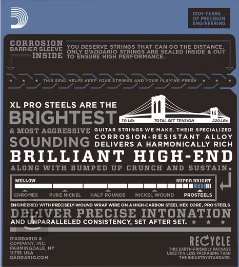 Struny na elektrickou kytaru D’addario XL ProSteels vám nabídnou výjimečně jasný a pronikavý zvuk, který se prosadí v jakémkoliv mixu. Jsou vyrobeny z unikátní, vysoce magnetické ocelové slitiny, která produkuje jasný, nakřáplý tón s dlouhým sustainem. Jejich základem je šestihranné ocelové jádro, které zajišťuje perfektní intonaci, dlouhou životnost a konzistentní pocit ze hry. Vinuté struny jsou potažené drátem z nerezové oceli, která perfektně spolupracuje s magnetickými snímači a poskytuje tak neuvěřitelně průrazný tón. Ideální na koncerty i do studia.