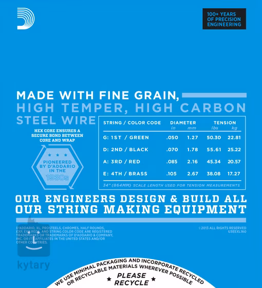 Struny pro elektrické baskytary značky D’addario z řady XL Nickel Wound jsou oblíbené pro svůj vyvážený tón a zvukovou všestrannost, díky čemuž je využijete v jakémkoliv hudebním stylu. Právě proto se v rámci portfolia značky D’addario jedná o naprostý bestseller. Struny jsou vyrobeny z šestrihranného ocelového jádra s vysokým obsahem uhlíku a jsou potaženy poniklovanou ocelí. Jejich výroba probíhá ve Spojených státech amerických.