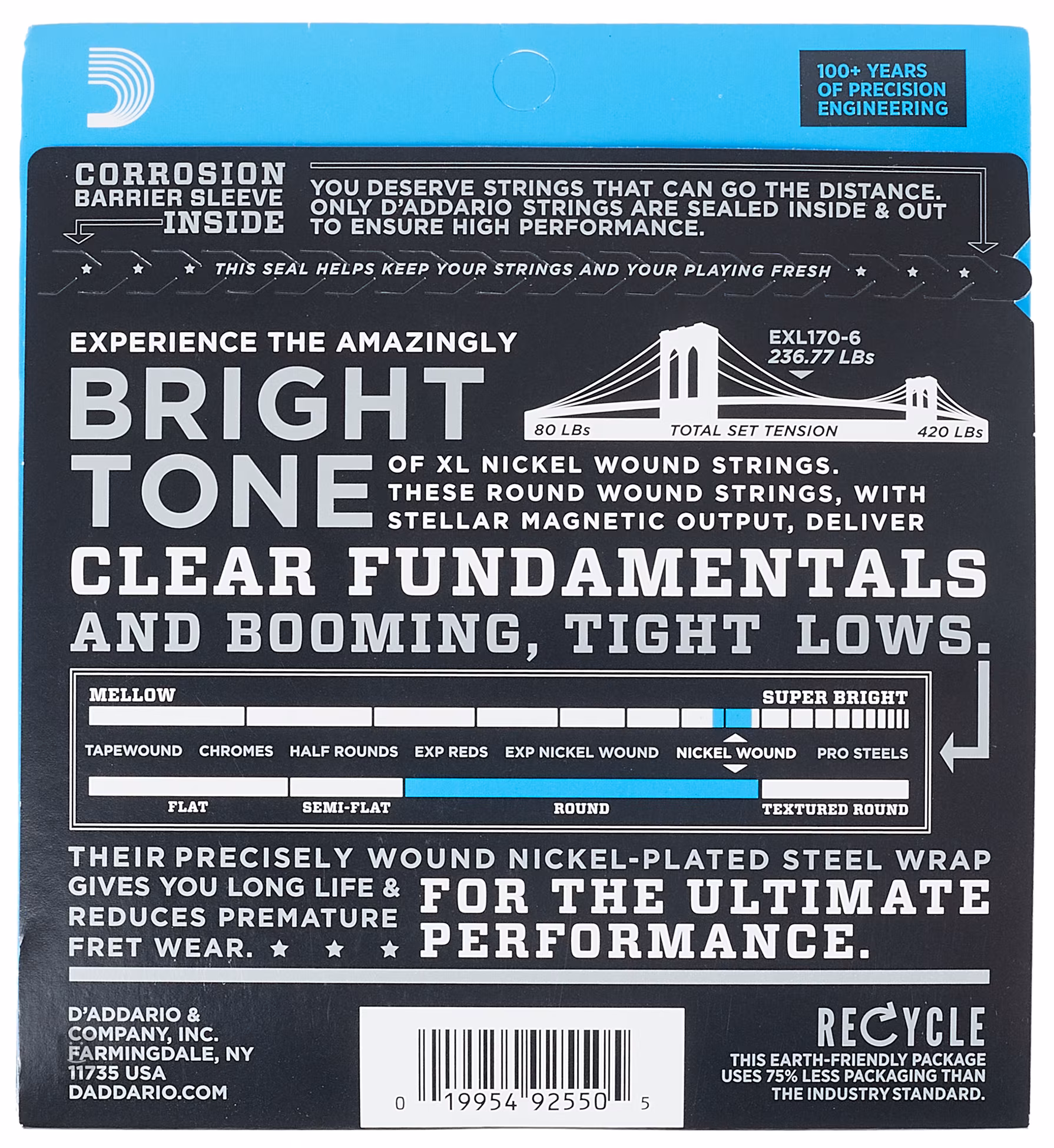 Struny pro elektrické baskytary značky D’addario z řady XL Nickel Wound jsou oblíbené pro svůj vyvážený tón a zvukovou všestrannost, díky čemuž je využijete v jakémkoliv hudebním stylu. Právě proto se v rámci portfolia značky D’addario jedná o naprostý bestseller. Struny jsou vyrobeny z šestrihranného ocelového jádra s vysokým obsahem uhlíku a jsou potaženy poniklovanou ocelí. Jejich výroba probíhá ve Spojených státech amerických.