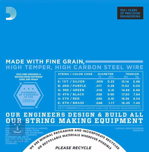 Struny z řady EXP Coated Nickel Wound lze popsat jako struny s nejpřirozenějším zvukem a nejdelší životnosti, které v nabídce D’Addario naleznete. Využívají potahu EXP, díky kterému jsou kovové struny chráněny mikrovrstvou speciálního materiálu, jenž slouží jako vysoce odolná ochrana proti poškození a zároveň zpříjemňuje hraní. V zásadě tyto struny nabízí stejný tón a feeling jako populární struny z řad XL, ale zároveň až 4x delší životnost.