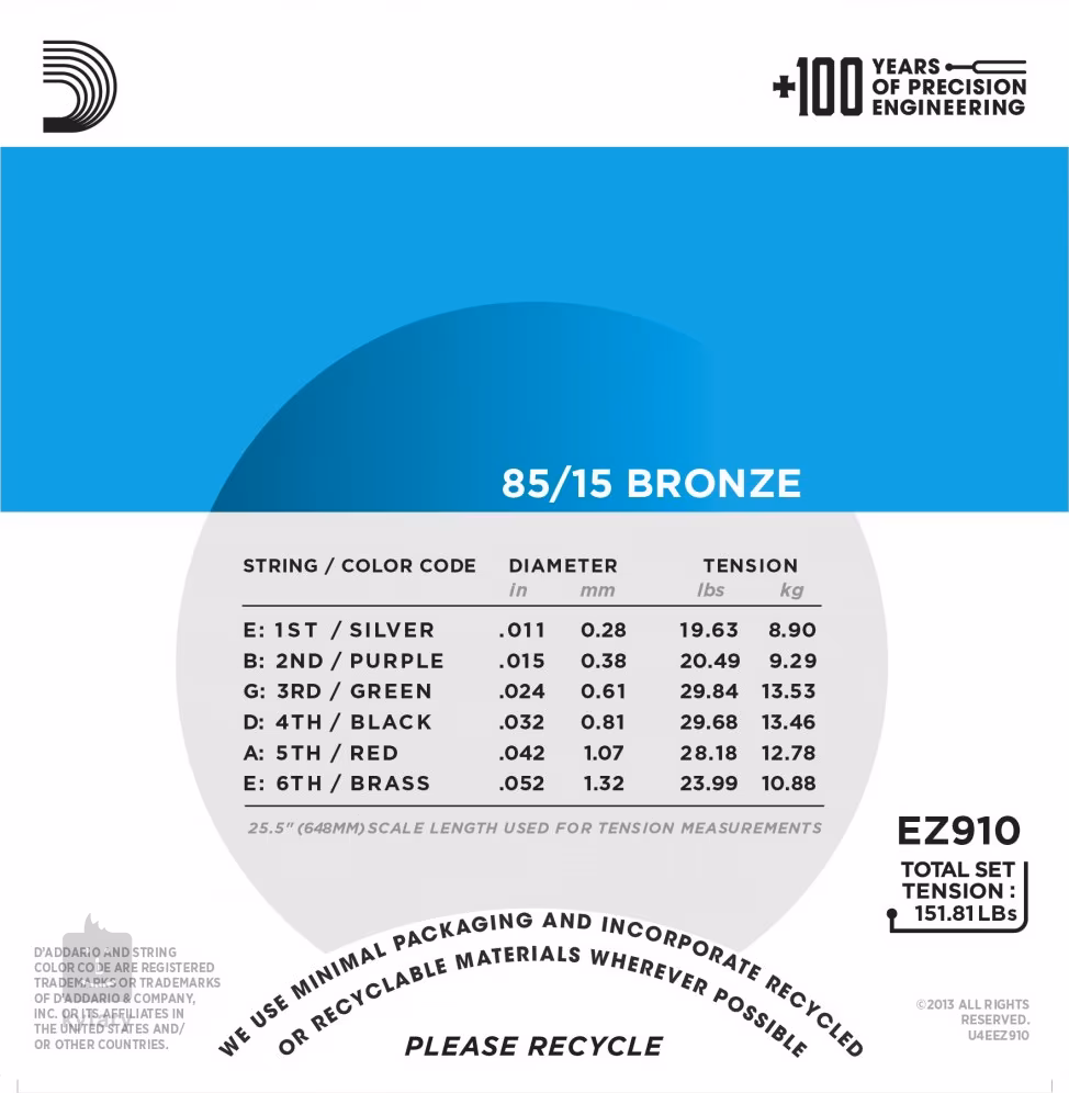 Kovové struny D'Addario z řady EZ mají ocelové jádro a vinutí z bronzového materiálu (85/15), který jim dodává jasný, pevný a silný tón. Zároveň vynikají dlouhou životností. V tomto balení najdete struny s tvrdostí 011", která představuje zlatou střední cestu mezi silnou zvučností a pohodlím při hraní.
