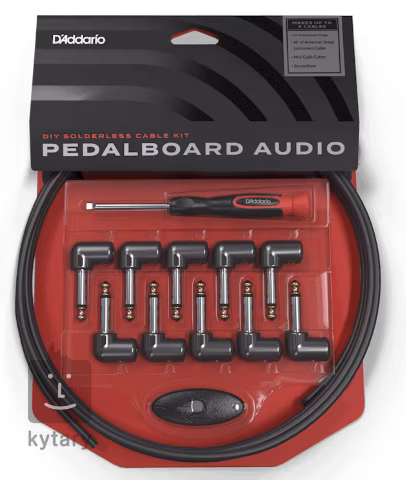 Řekněte sbohem nepřehledné změti kabelů ve vašem pedalboardu. S touto sadou od D’Addaria si snadno upravíte propojovací kabely přesně tak, jak potřebujete. Sada obsahuje tři metry kvalitního stíněného kabelu a deset úhlových konektorů typu jack 6,3 mm, které jednoduše připevníte bez potřeby pájení. Součástí je také šroubovák k utažení konektorů a nástroj na přesné stříhání kabelu.