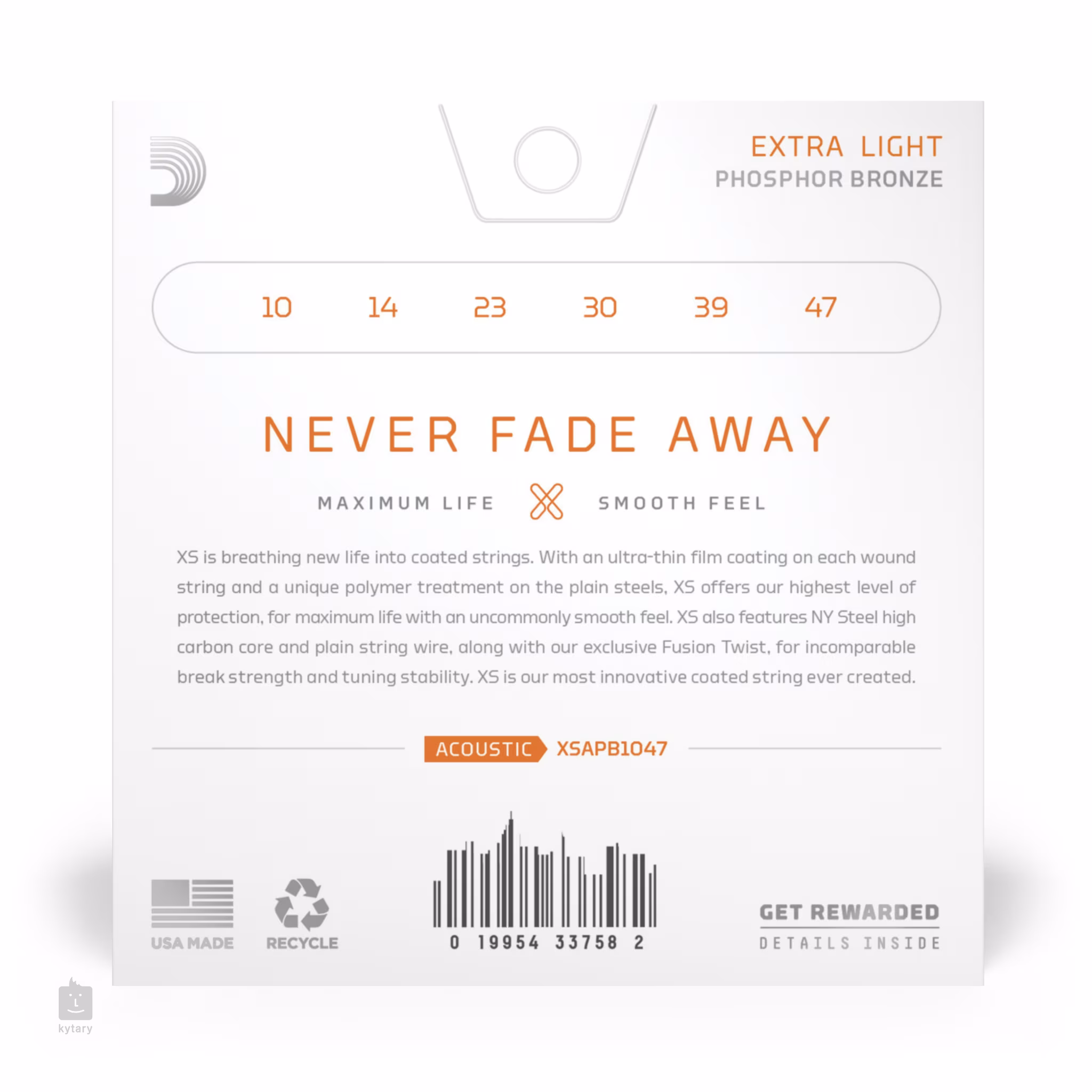 Nejvyšší řada strun XS z dílny společnosti D'Addario představuje technologický průlom na poli potahovaných strun a patří mezi špičku toho, co můžete v katalogu této světoznámé firmy najít. Tyto struny v sobě kombinují to nejlepší z řady XT, ale posouvají laťku ještě o krok výše. Neuvěřitelně tenký potah jim dodává bezkonkurenční životnost a příjemně hladký povrch, přičemž nikterak neubírá na skvělých zvukových vlastnostech, kterými jsou struny D'Addario pověstné. Díky šestihrannému ocelovému jádru s vysokým podílem uhlíku a vinutí z fosforbronzu nabízí vřelý a mohutný zvuk s vyváženým podílem všech frekvencí, dlouhým sustainem a skvělou dynamikou. Zároveň se pyšní výbornou stabilitou ladění a vysokou odolností. Jedná se zkrátka o špičkové struny, které vám vydrží velmi dlouho.