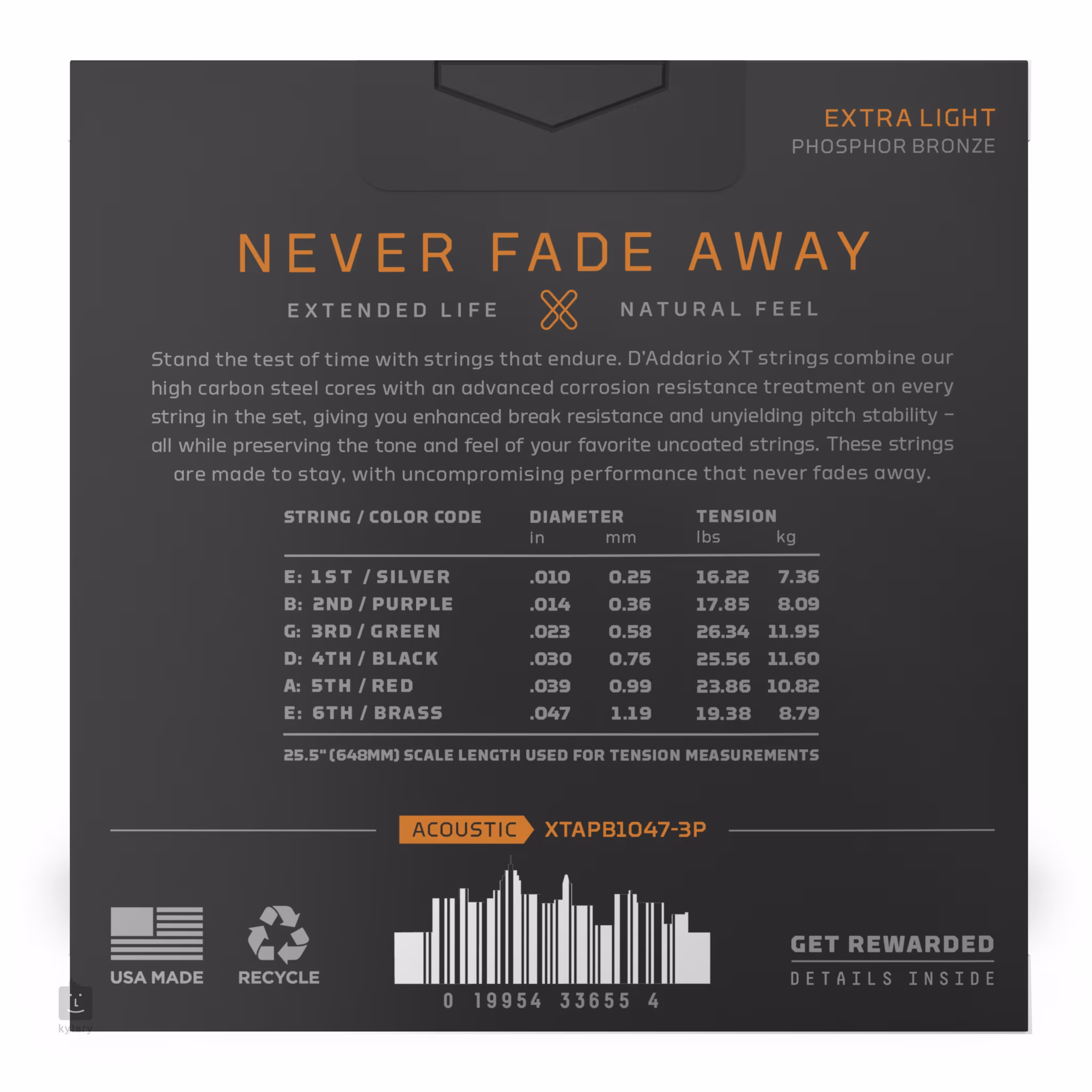 Nejvyšší řada strun od největšího výrobce strun na světě – to je nová řada D’Addario XT. Tato vlajková loď v katalogu značky D’Addario spojuje inovativní technologie s nejmodernějšími materiály a precizním provedením. Díky speciální povrchové úpravě vydrží struny série XT až čtyřikrát déle než tradiční neošetřené struny, aniž byste museli obětovat kvalitu zvuku nebo pocit ze hry. Díky šestihrannému jádru z vysokouhlíkové oceli a bronzovému vinutí se speciální povrchovou úpravou odpuzující vlhkost nabízí struny vysokou odolnost a životnost, perfektní stabilitu ladění a mohutný zvuk s vyváženým podílem všech frekvencí, dlouhým sustainem a skvělou dynamikou. Antikorozní balení strun zajistí, že k vám dorazí stejně čerstvé jako v moment, kdy opustily newyorskou továrnu.