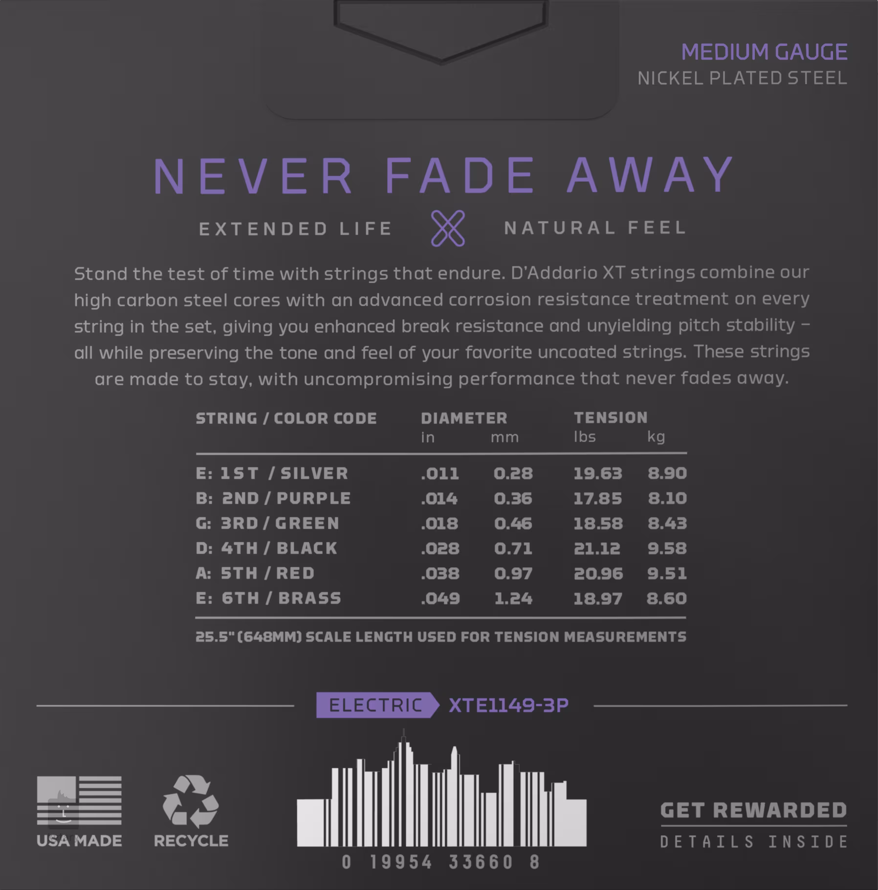 Prémiové struny pro elektrickou kytaru D’addario XT vydrží díky speciálnímu antikoroznímu potahu až čtyřikrát déle než tradiční neošetřené struny, přičemž si zachovávají jasnost zvuku a přirozený pocit ze hry. Jejich základem je šestihranné jádro ze speciální ocelové slitiny NY Steel, která je o 40 % odolnější než běžná ocel, takže se nemusíte obávat častého praskání. Vinutí z poniklované oceli navíc využívá speciální technologie Fusion Twist, díky níž je ladění o 131 % stabilnější než u běžných strun. Výsledkem jsou struny s maximální možnou výdrží, které jsou zároveň výjimečně flexibilní, odolné a precizně ladí. Ideální pro všechny náročné hráče, kteří se spokojí jen s tím nejlepším.