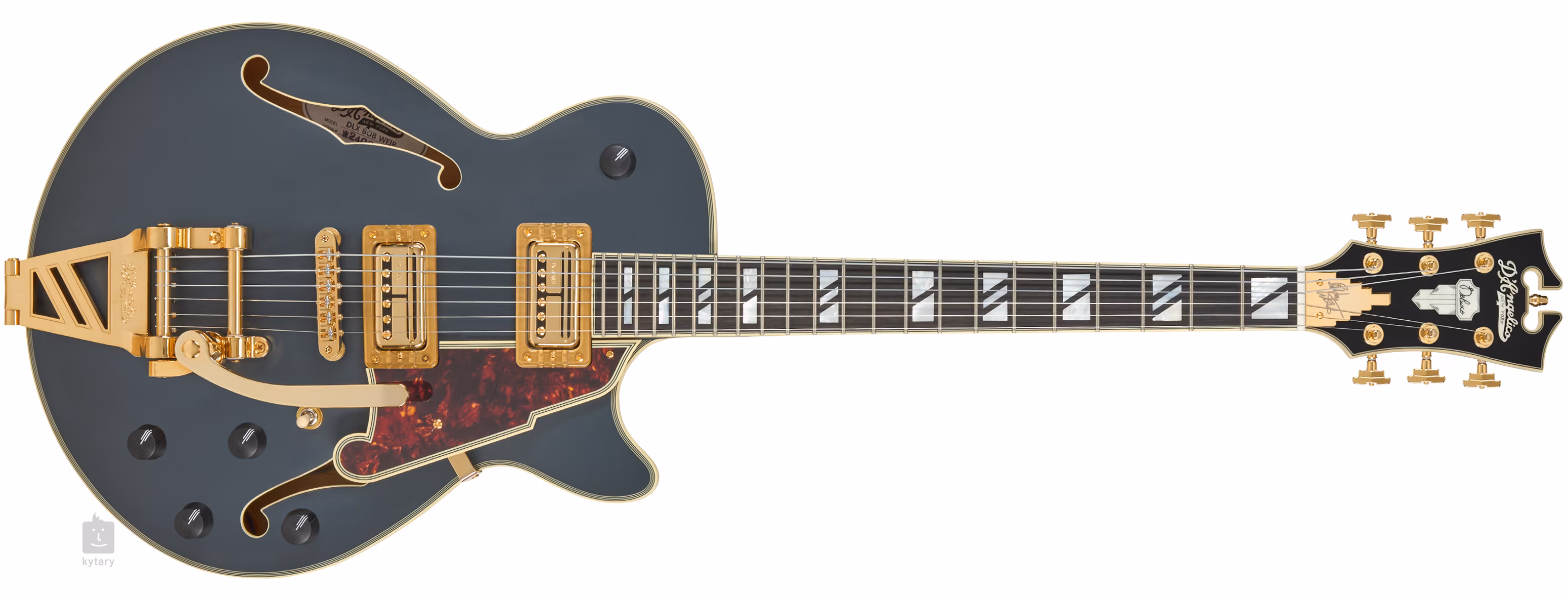 Tělo kytary vyvažuje pro tuto firmu typická hlavice v Art Deco designu ozdobená perleťovým firemním logem a inlayem (Mother-of-Pearl). Stabilní ladění a dobrý sustain zaručuje uchycení strun přes nultý pražec z materiálu Graphtech TusQ v uzamykatelných mechanikách Grover 509 Super Rotomatic Locking a přes kobylku TOM v D'Angelico Shield tremolu. Luxusní zpracování kytary podtrhuje vícevrstvá lemovka těla, hmatníku a hlavy, pětivrstvý pickguard Scalini, ebenové krytky potenciometrů a hardware ve zlatém provedení.