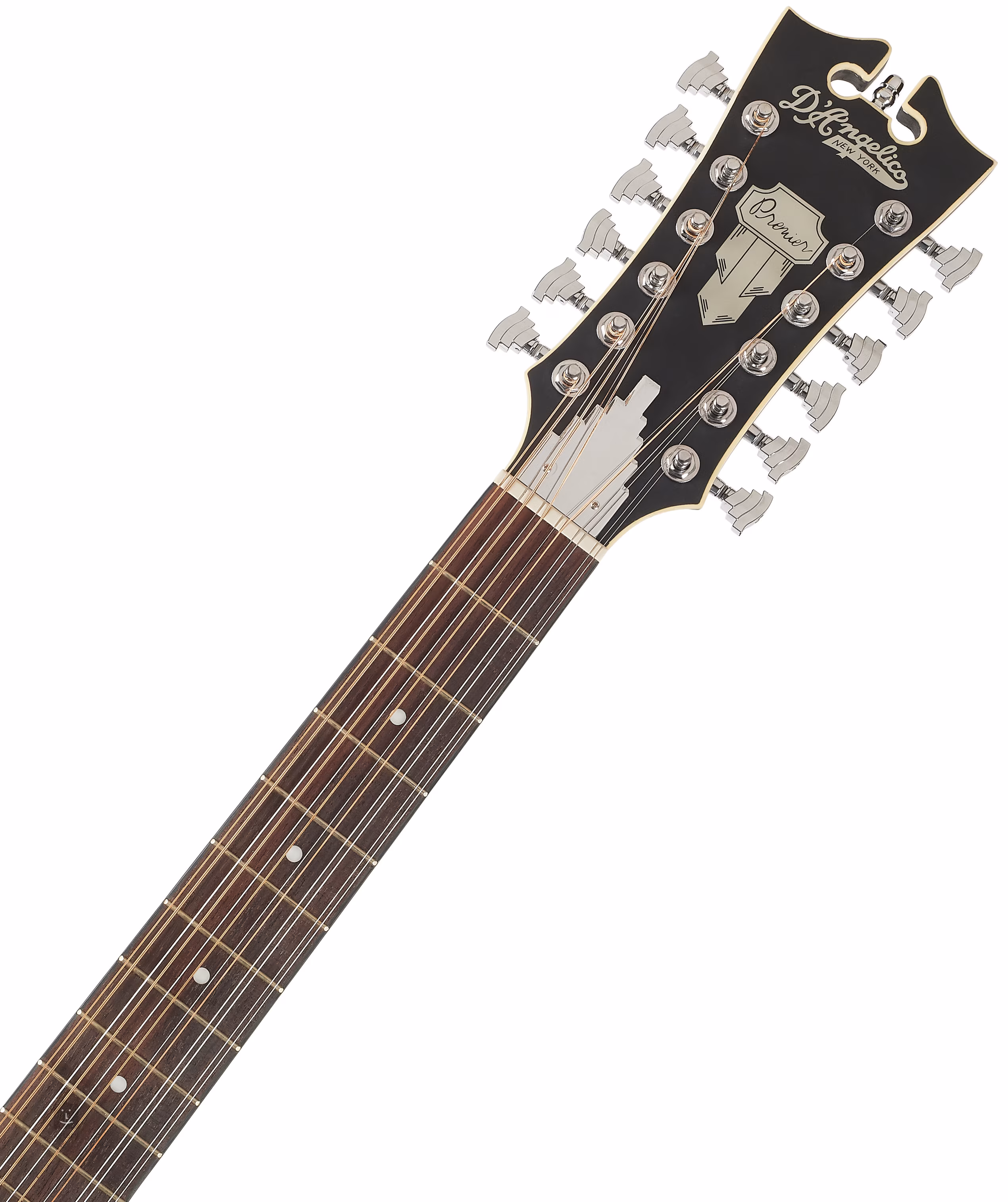 Tělo kytary vyvažuje hlavice v tradičním tvaru nástrojů D'Angelico ozdobená firemním logem z imitace perleti. Struny jsou přes sedlový a nultý pražec z plastového materiálu (PPS) uchyceny ve firemních mechanikách v chromovaném provedení a kobylce z merbau. Vzhled nástroje zpestřuje rozeta složená z černobílých prstenců z ABS a černobílá obvodová lemovka těla.