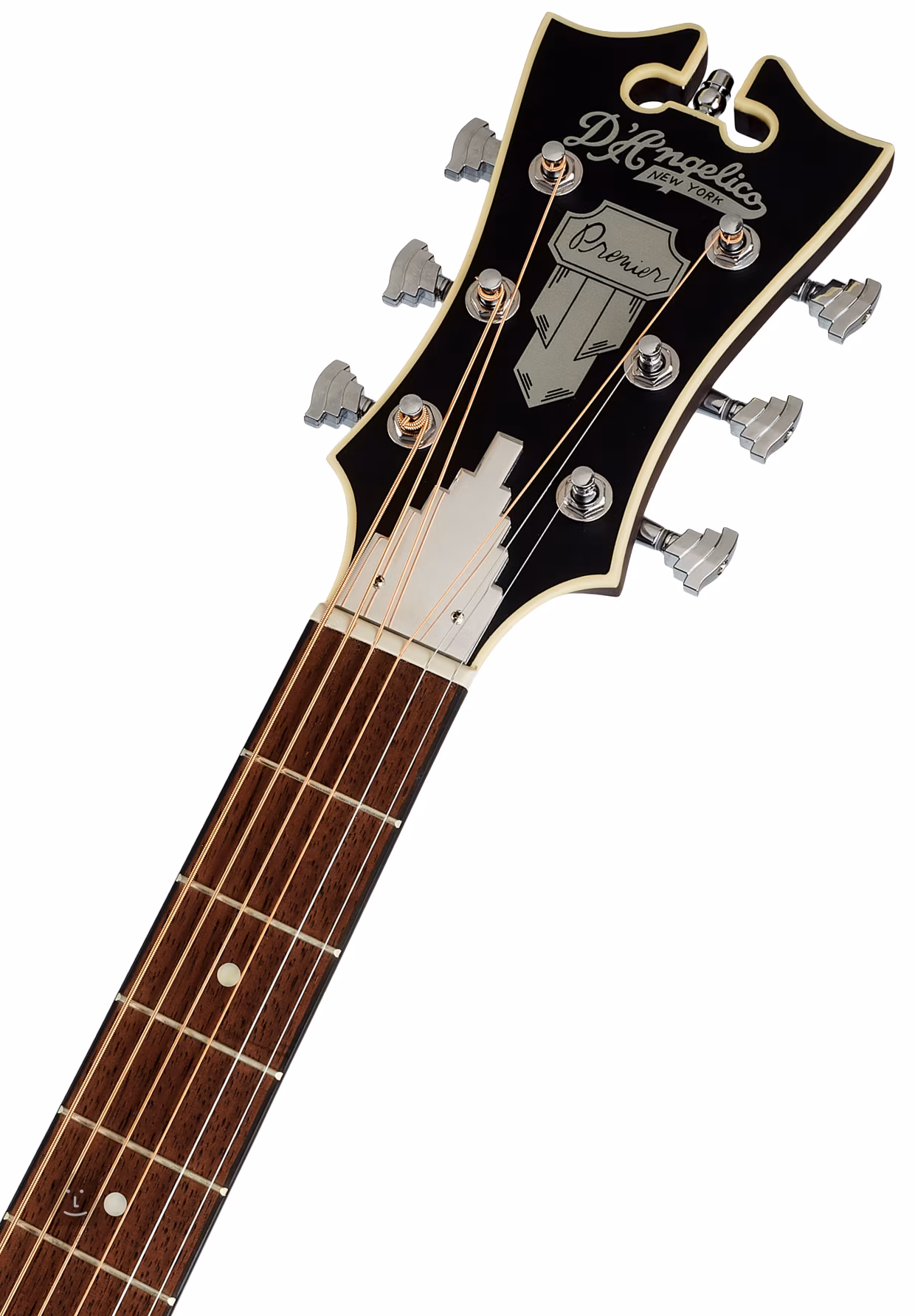 Tělo kytary vyvažuje hlavice v tradičním tvaru nástrojů D´Angelico ozdobená firemním logem z imitace perleti. Struny jsou přes sedlový a nultý pražec z plastového materiálu (PPS) uchyceny v již zmíněných firemních mechanikách v chromovaném provedení a kobylce z merbau. Vzhled nástroje zpestřuje rozeta složená z černobílých prstenců z ABS a černobílá obvodová lemovka těla.
