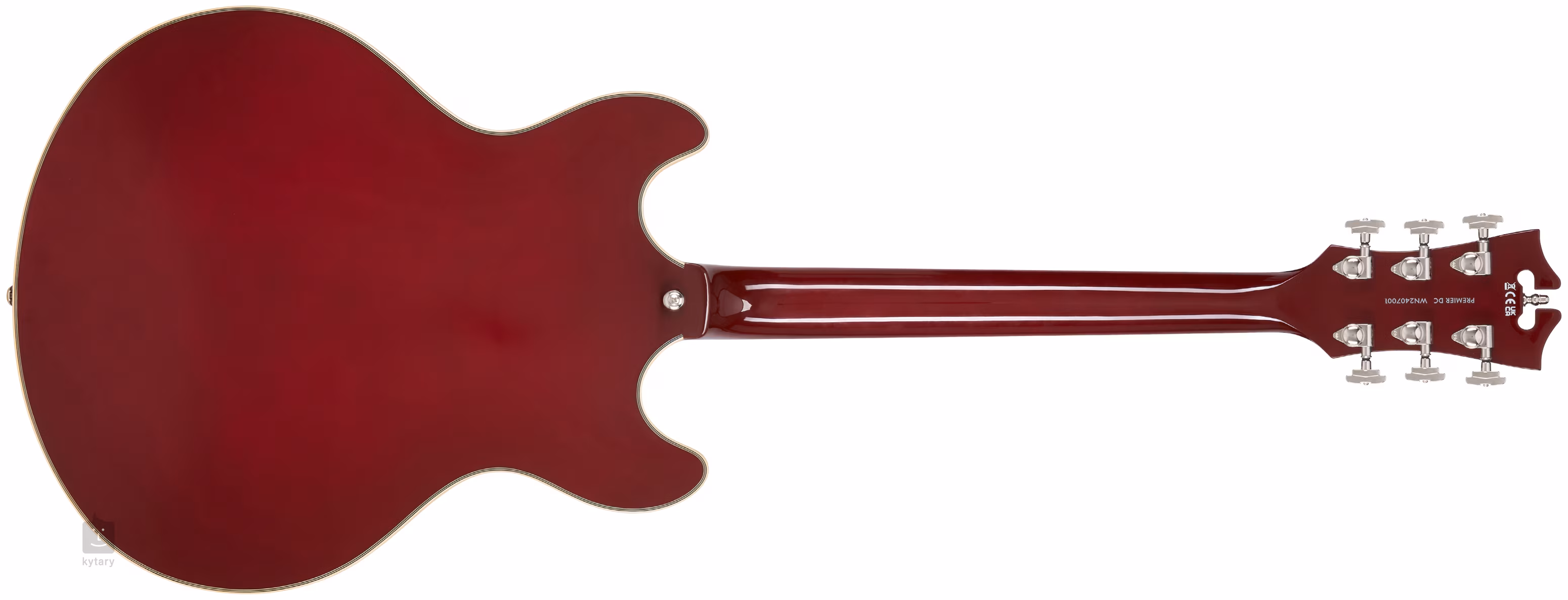 Pololubová konstrukce modelu Premier DC Burnt Red je zhotovena z laminovaného javoru a středového bloku, který zpevňuje přední desku a potlačuje nežádoucí efekt “vazbení” lubového těla. K javorovému krku je přilepen ořechový hmatník osazený dvaadvaceti pražci z pakfongu (nickel silver) velikosti Medium Vintage. Úzký C profil krku zaručuje plynulý pohyb prstů po hmatníku a pohodlný dohmat, orientaci na hmatníku usnadňují polohové bloky z imitace perleti.