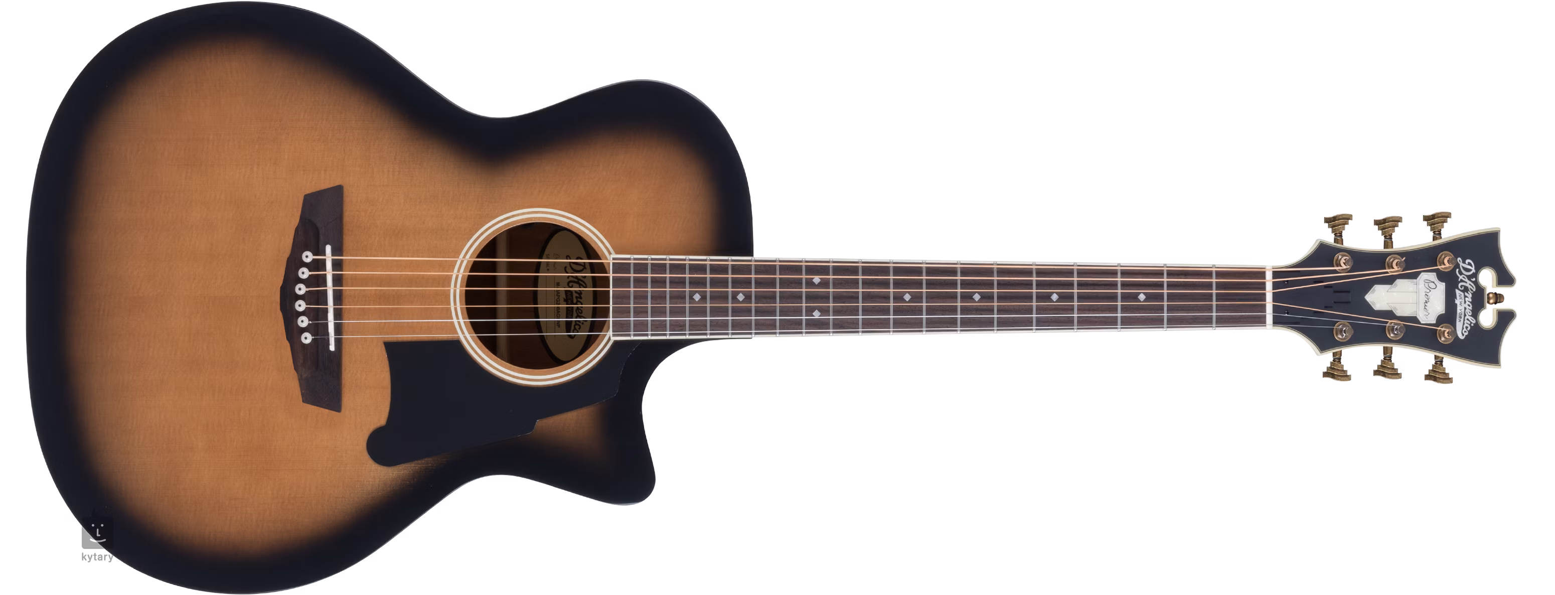 Řada Premier představuje cenově dostupnější nástroje z portfolia firmy D'Angelico, které ovšem splňují veškeré požadavky na kvalitu řemeslného zpracování spojené s touto značkou. Premier Gramercy jsou elektroakustické kytary v populárním tvaru Grand Auditorium, které vás potěší pěkným designem a vřelým vyváženým tónem. Jejich akustické kvality oceníte při hře trsátkem i prstovou technikou. Přední deska kytary PREMIER GRAMERCY Grand Auditorium CE Aged Burst je zhotovena z masivu smrku, zadní deska a luby jsou vyrobeny z laminovaného sapele. Dobré akustické vlastnosti kytary podporuje snížené X žebrování (Scalloped X). K mahagonovému krku s užším „C“ profilem je přilepen palisandrový hmatník osazený dvaceti pražci velikosti Medium Jumbo. Orientaci na hmatníku usnadňují polohové značky z imitace perleti ve tvaru malých démantů. Tělo kytary vyvažuje hlavice v tradičním tvaru nástrojů D'Angelico ozdobená firemním logem z imitace perleti. Struny jsou přes sedlový a nultý pražec z kosti uchyceny v ladících mechanikách Stairstep Wave a palisandrové kobylce. Stylový vzhled kytar D'Angelico podtrhuje hardware v provedení Antique Bronze, ebenová krytka výztuhy a prvky ve stylu Art-Deco - ať už tvar hlavice, design ladících mechanik, poziční značky na hmatníku nebo nově designovaný tvar pickguardu Scalini. Možnost ozvučení nabízí elektronika Fishman Presys-VT s ovladači Volume a Tone decentně zasazenými do ozvučnicového otvoru nástroje.