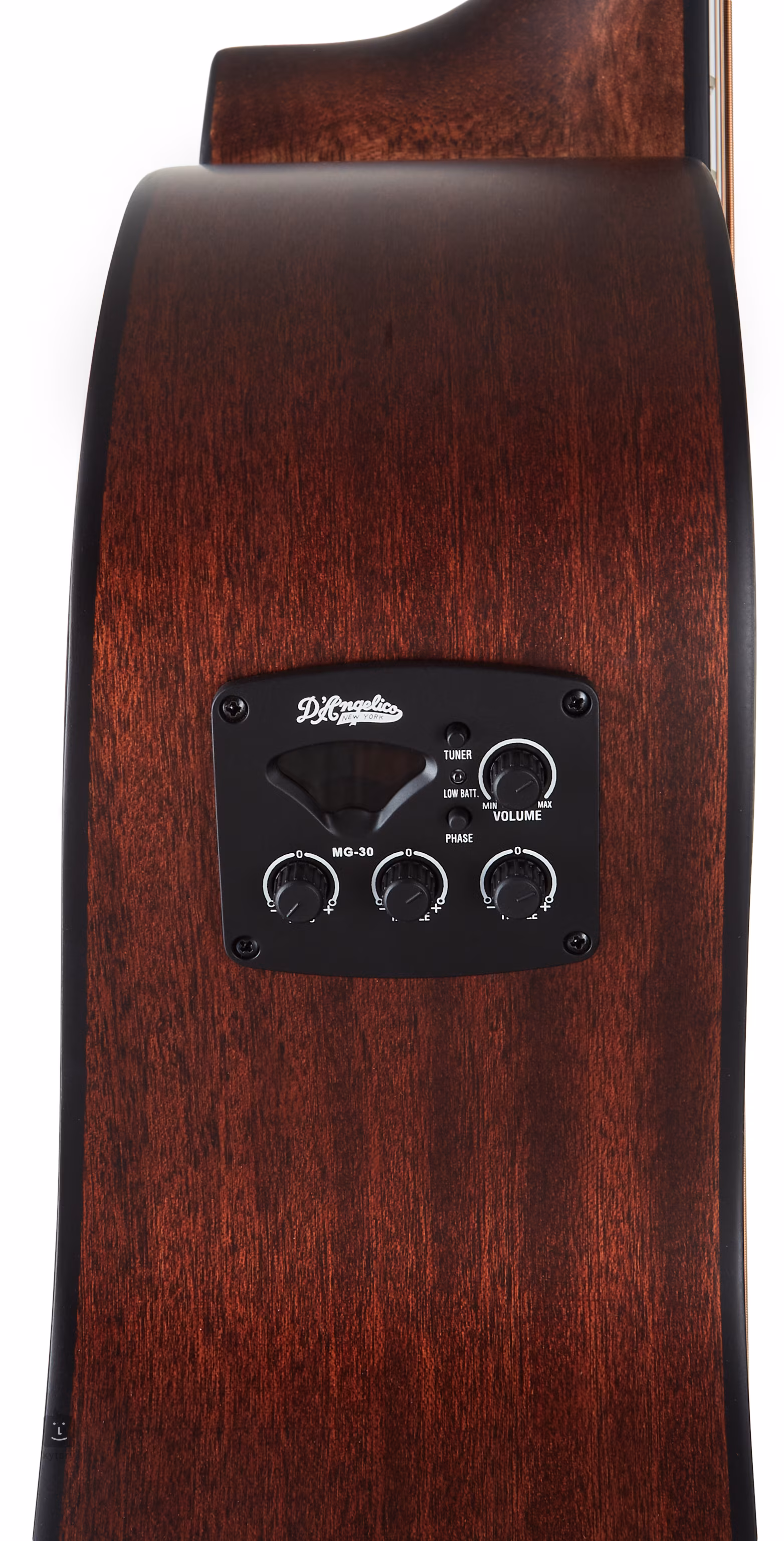 O ozvučení nástroje se stará preamp D’Angelico MG-30 s integrovanou ladičkou zabudovaný do lubu kytary.