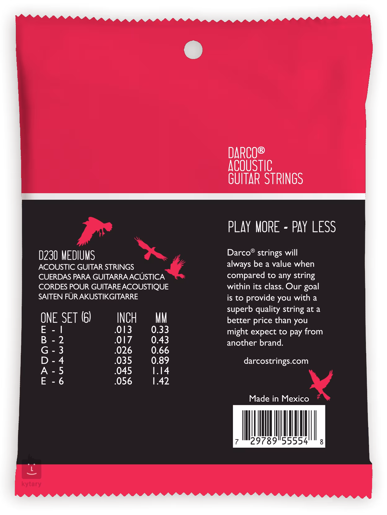 Struny pro akustickou kytaru Darco jsou možná překvapivě málo známé vzhledem k tomu, jak dobře hrají a jak dlouhou životnost nabízí. Jsou vyrobeny tak, aby nabízely konzistentní zvuk po celou dobu své nadstandardně dlouhé životnosti. Použito je pocínované ocelové jádro a vinutí z fosforbronzu.