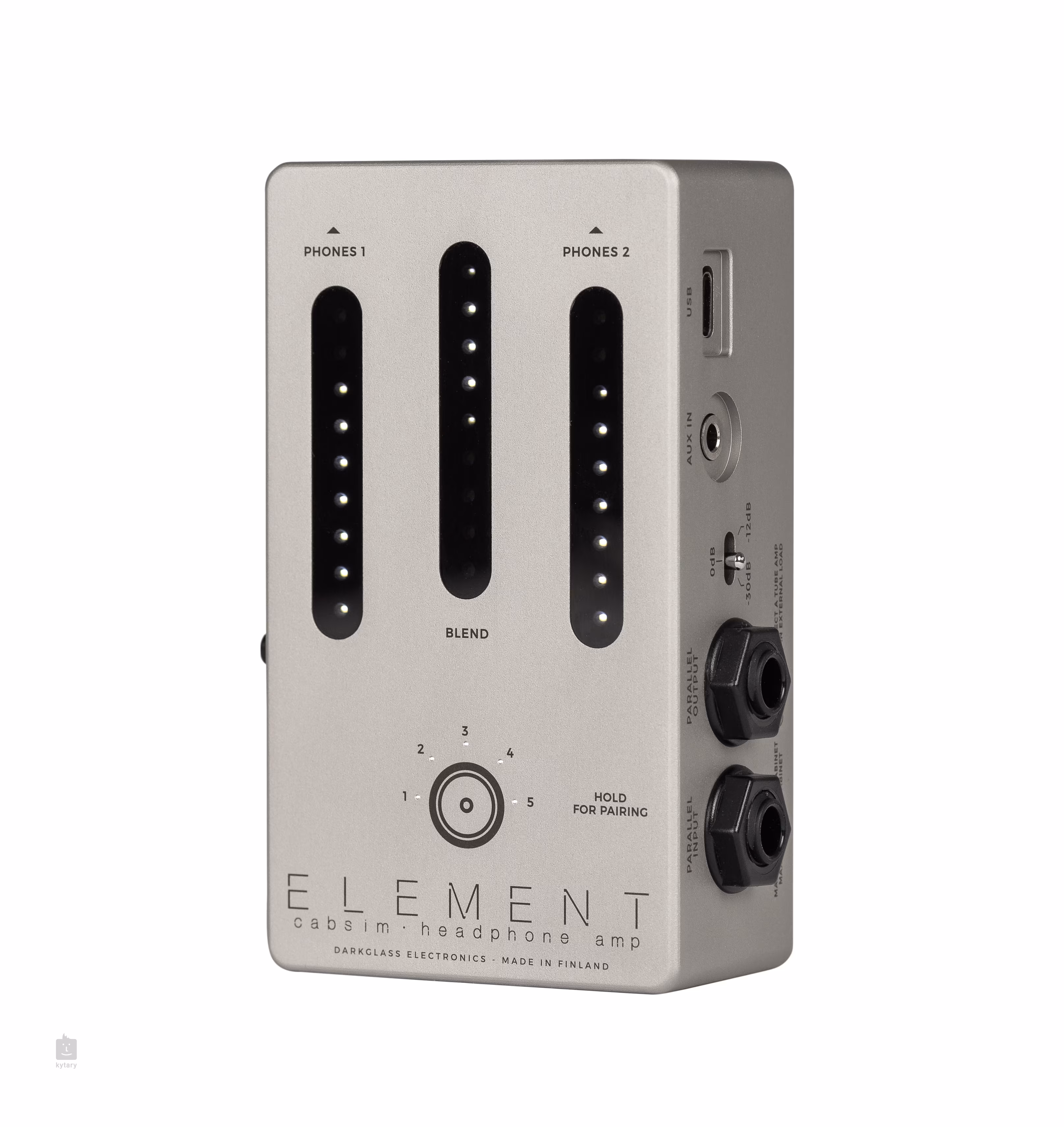 Darkglass Element obsahuje pět simulací reproboxů, další můžete snadno přidávat pomocí programu Darkglass Suite. Bluetooth technologie umožňuje hraní s vašimi oblíbenými skladbami, dva sluchátkové konektory zase jamování s ostatními hudebníky. Nechybí XLR výstup pro přímé propojení s PA systémem nebo zvukovou kartou, přepínač Ground Lift, utlumení vstupu 0dB/-12dB/-30dB, stereo Aux vstupem pro připojení externího zdroje, 6,3 mm paralelním výstupem pro připojení k zesilovači a USB-C portem pro propojení s počítačem. A stejně jako všechny pedály Darkglass, i tento byl vyroben přímo ve Finsku.