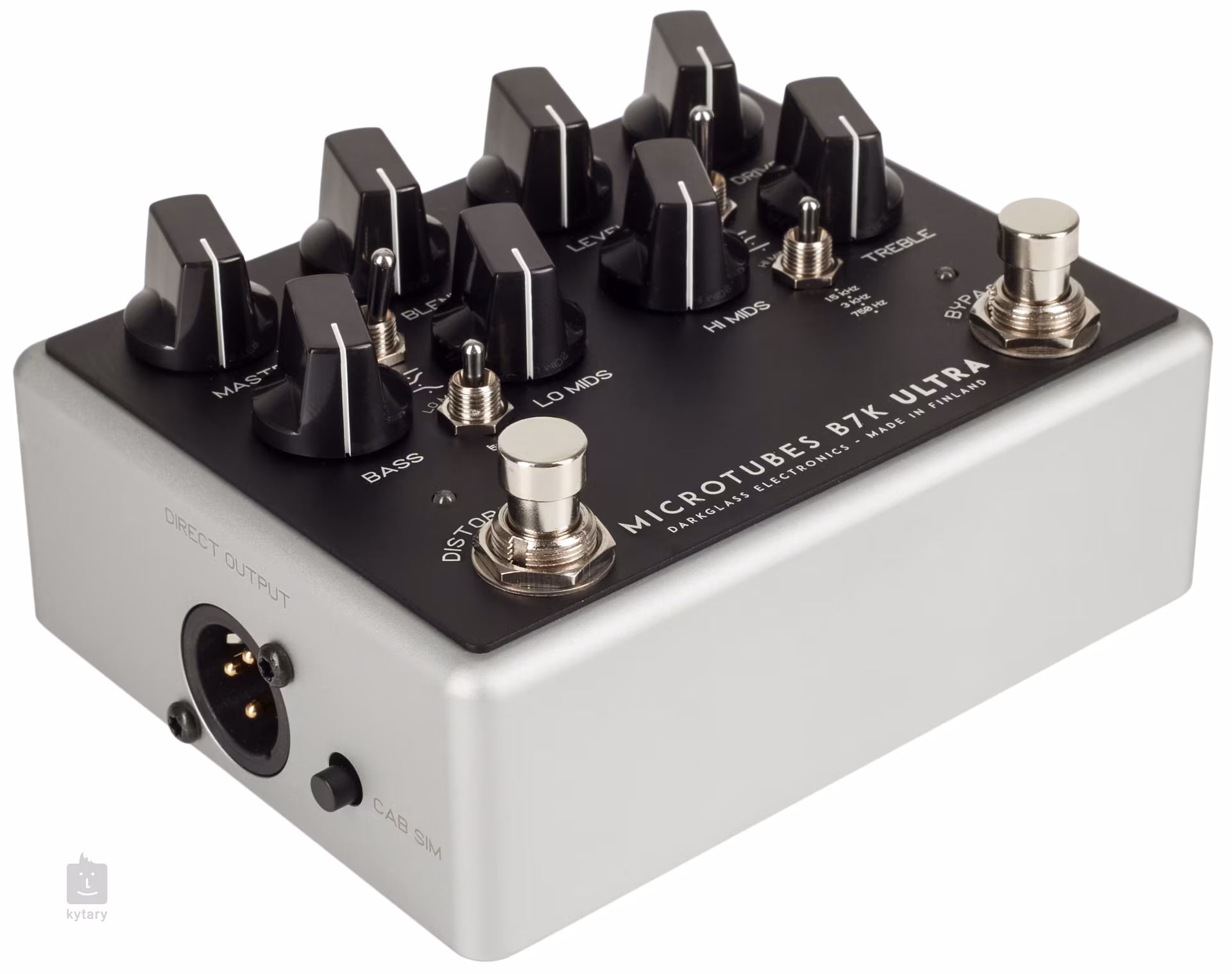 V rámci designu ovladačů zůstala značka Darkglass u ověřeného konceptu. Pod pevnou a nenápadnou černou konstrukcí pedálového efektu se skrývá syrová síla hi-gain zkreslení z efektu B7K s možností ještě detailnějšího nastavení, kterou ocení každý baskytarista. Kvalitní obvody a součástky se postarají o přirozené zkreslení a vy se tak nemusíte bát o ztrátu jakýchkoliv frekvenci. Opět tak máte možnost tvarovat hutný basový tón pomocí čtyřpásmového ekvalizéru a čtyř switchů, které určují operační frekvenční pásmo ovladačů Lo Mids (+/- 12 dB na 250 Hz/500 Hz/1 kHz), Hi Mids (+/- 12 dB na 750 Hz/1,5 kHz/3kHz) a frekvenční odezvu v basových a výškových frekvencích. Nastavení základních ovladačů Master, Blend, Level a Drive určuje výstupní hlasitost předzesilovače, poměr dry/wet signálu, hlasitost zprocesovaného signálu a míru zkreslení.