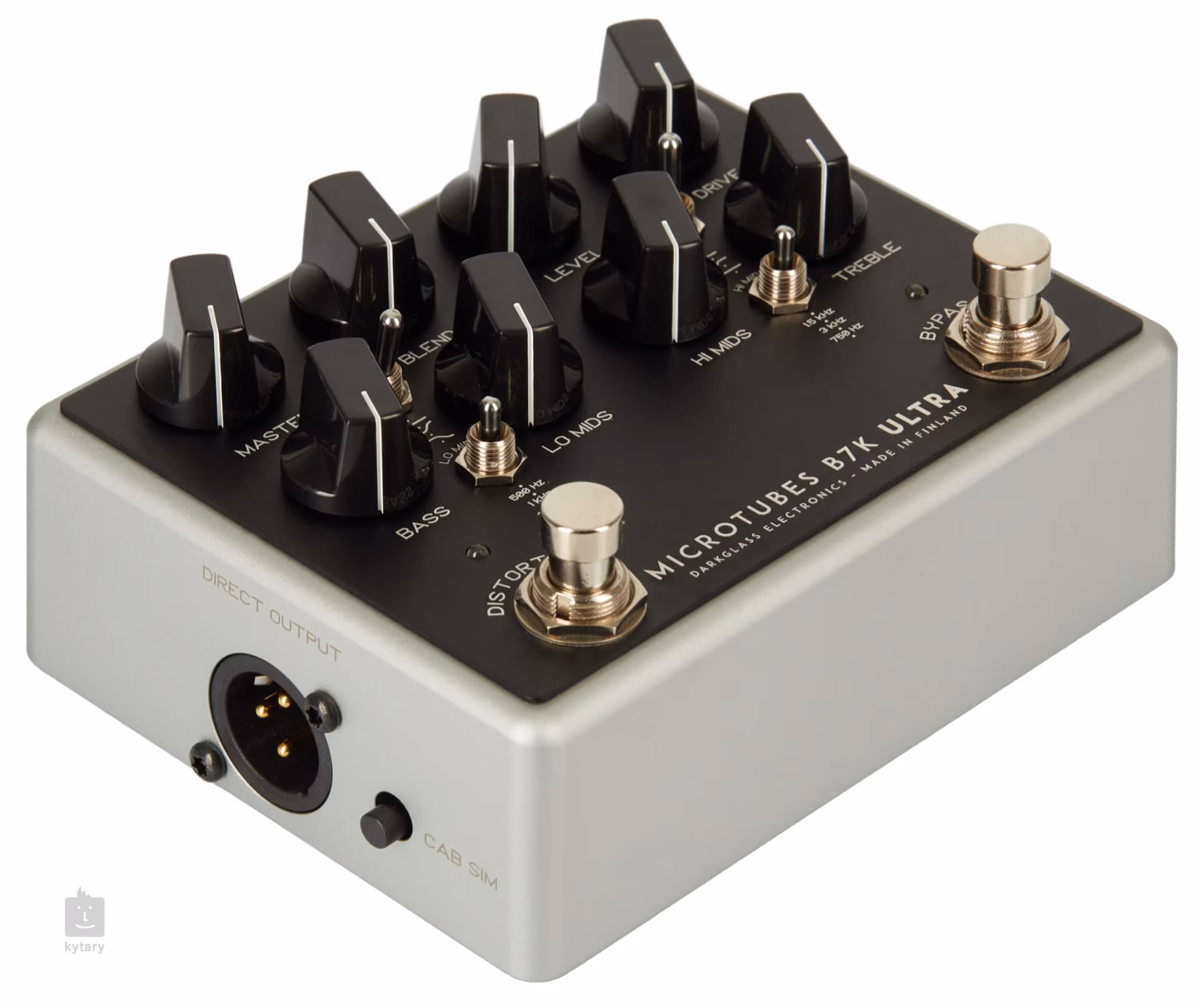 Pedálový efekt typu Preamp / Distortion. Pod pevnou a nenápadnou černou konstrukcí Microtubes B7K Ultra se skrývá syrová síla hi gain zkreslení z efektu B7K s možností ještě detailnějšího nastavení, kterou ocení každý baskytarista. Kvalitní obvody a součástky se postarají o přirozené zkreslení a vy se tak nemusíte bát o ztrátu jakýchkoliv frekvenci. Přední panel nabízí potenciometry Master pro nastavení celkové hlasitosti, Drive, pro nastavení zkreslení, Level pro nastavení úrovně hlasitosti zkresleného signálu a Blend, pro nastavení poměru mezi zkresleným a čistým zvukem. Výhodou jsou dva přepínače, které se starají o frekvenční odezvu efektu. B7K Ultra je navíc vybaven samostatným spínáním pro sekci zkreslení a sekci bez zkreslení a čtyřpásmovým ekvalizérem s přepínači odezvy pro vysoké (1,5 kHz, 3 kHz a 750 Hz) a nízké (250 Hz, 500 Hz a 1 kHz) středové frekvenční pásmo. Výhodou je i tlačítko Ground Lift. Novinkou pro věz 2 je funkce Cab Sim, která simuluje reprobox a 3,5 mm Jack výstup pro sluchátka. Díky USB konektoru je možné do pedálu načítat IR soubory, které zaručí maximální flexibilitu při používání funkce Cab Sim. Efekt se napájí výlučně 9V adaptérem, který není součástí balení. Rozměry: 10,7 x 12 cm.