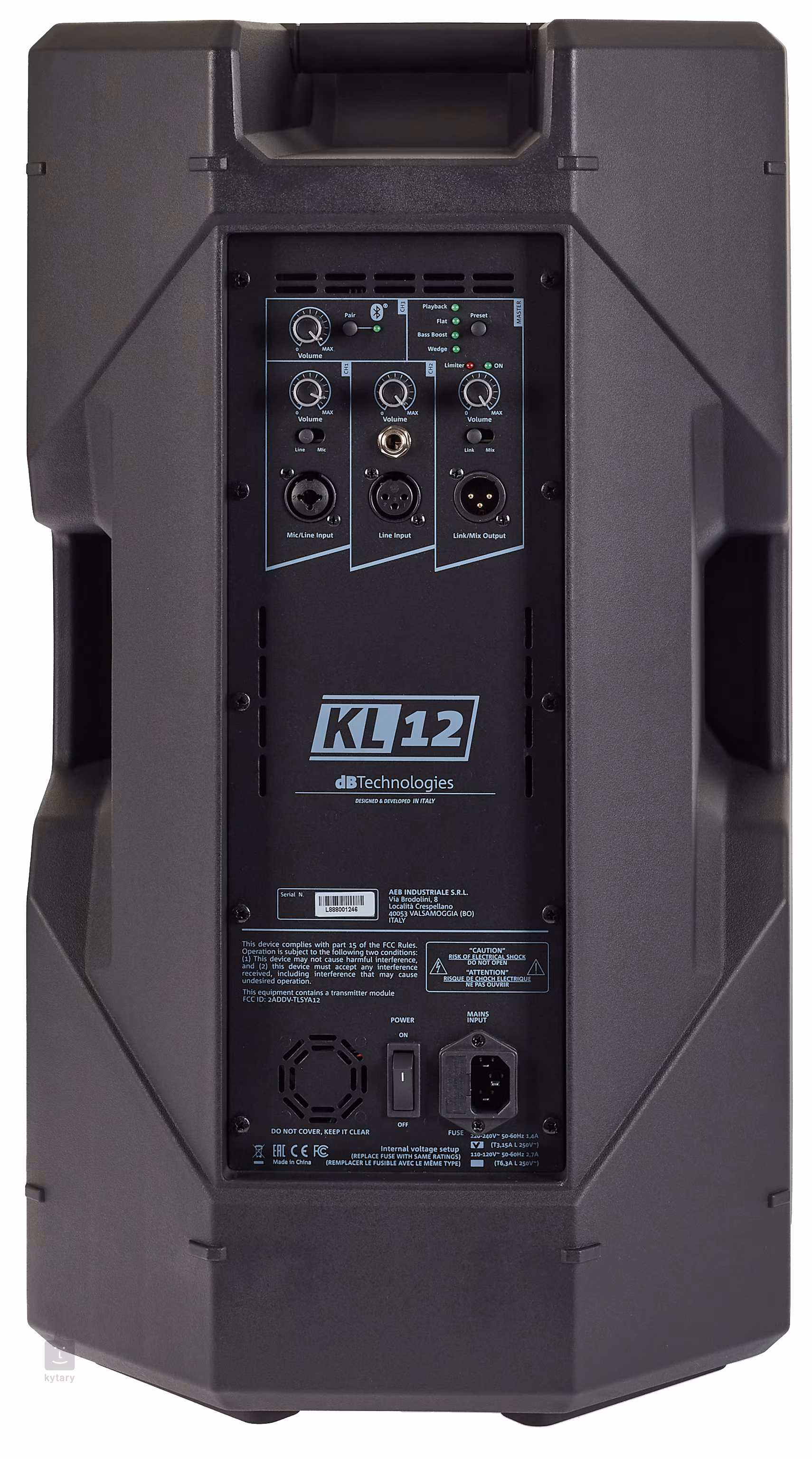 KL12 v sobě ukrývá 12“ basový a 1“ výškový reproduktor, které vám spolu s bi-amp zesilovačem třídy D pro LF a třídy AB pro HF zajistí maximální výkon až 800W. Zadní strana obsahuje tříkanálový mixpult s kombinovaným konektorem, XLR vstupem pro mikrofon a linkovým vstupem pro nástroj. Třetí kanál potom využijete pro připojení zařízení s Bluetooth technologií. Každý kanál obsahuje separátní ovladač hlasitosti a pro připojení do dalšího PA se zde nachází XLR výstup s dvoupolohovým přepínačem Line/Mix. K dispozici budete mít také DSP jednotku se čtyřmi přednastavenými presety pro co nejflexibilnější využití. KL12 můžete usadit na reproduktorový stojan, nebo využít zkoseného tvaru pro pódiový monitor. Tři integrovaná robustní madla vám potom zajistí pohodlný transport mezi produkcemi. Součástí balení je nylonový přepravní obal.