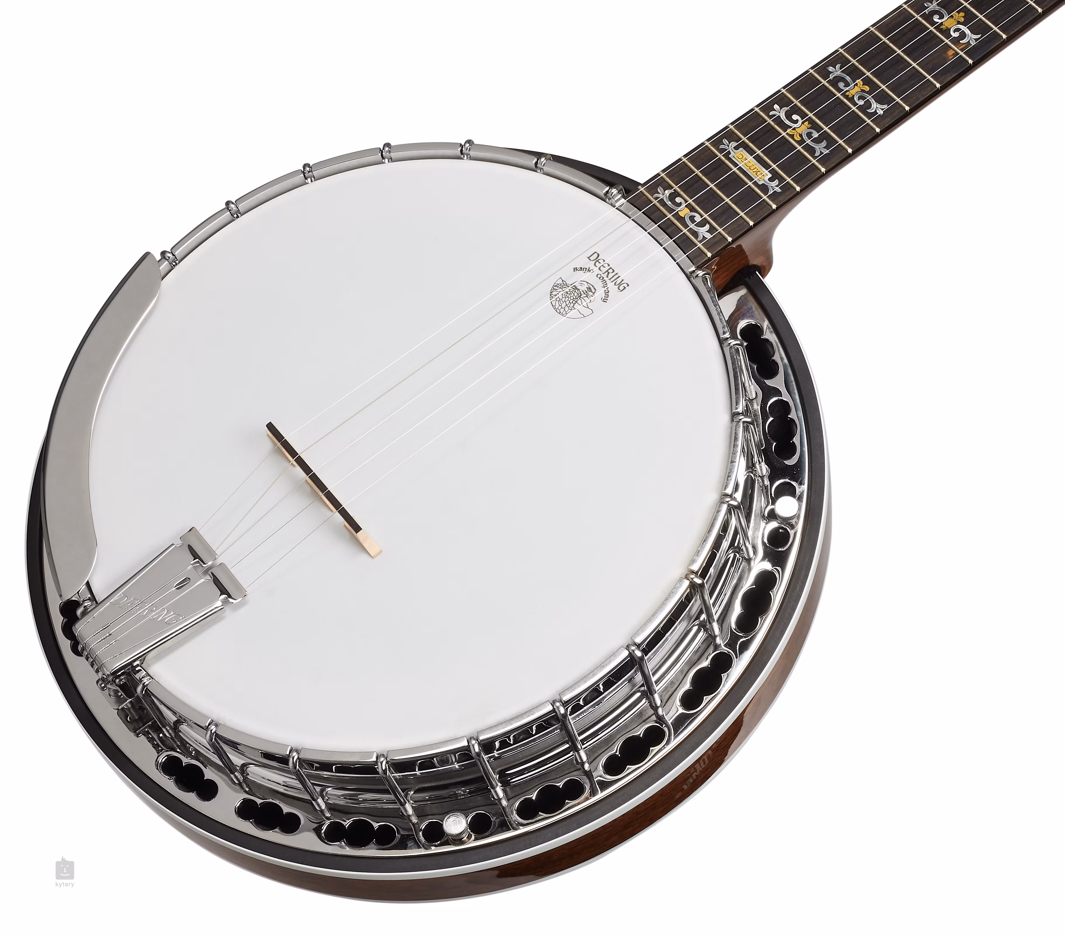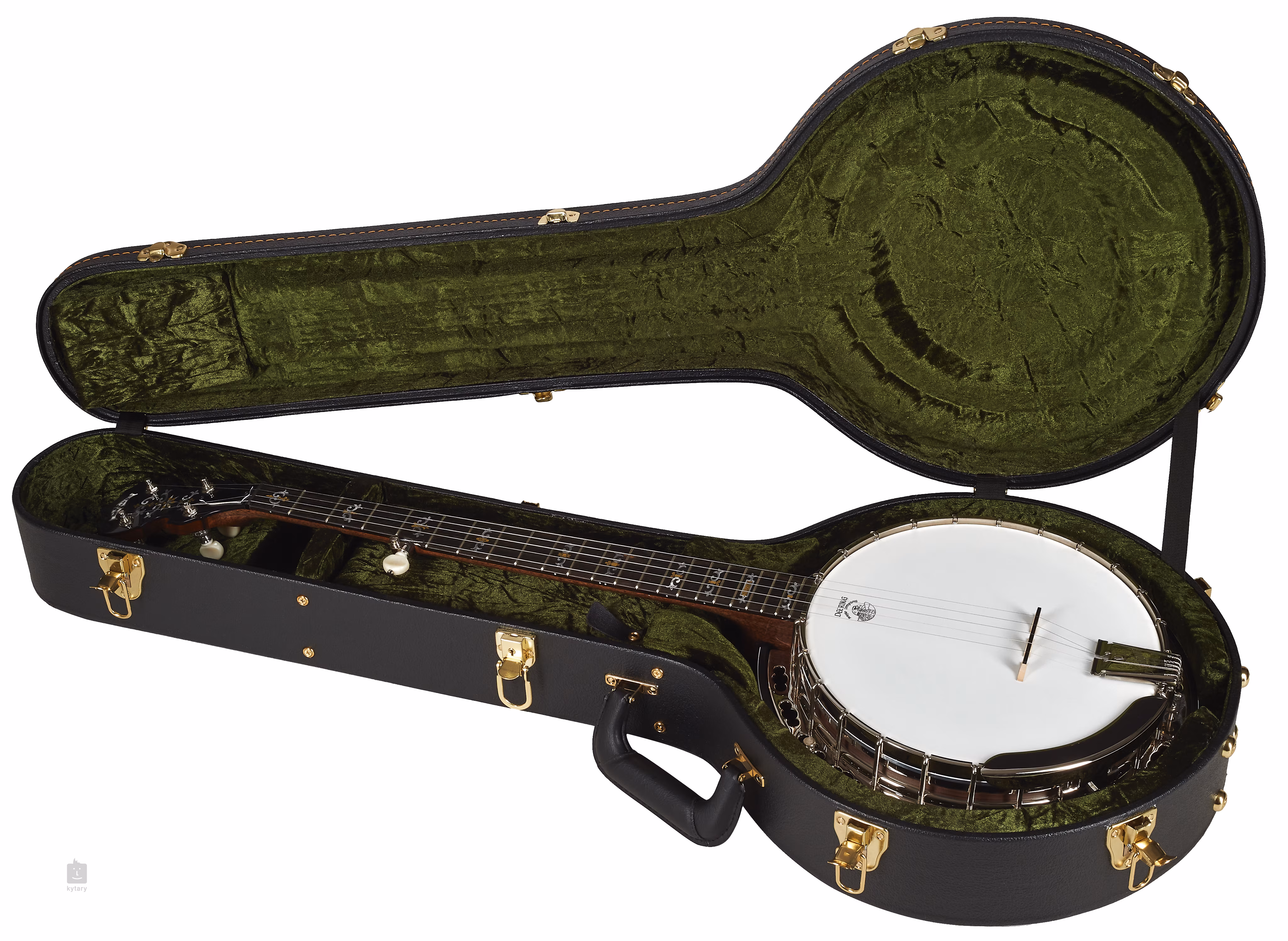 Struny jsou na jedné straně uchyceny v kvalitních mechanikách typu Planetary, na druhé přes kobylku z javoru/ebenu v nastavitelném struníku Deering True Tone z poniklované oceli. Zdobné rytiny na hlavici nástroje, ramenní opěrka a dekorativní zinkové mezikruží (flange) z jednoho dílu vhodně doplňují základní použité materiály po praktické i vizuální stránce.