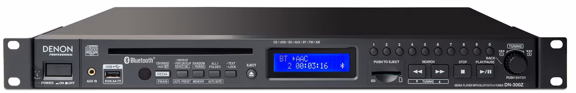 DN-300Z od Denon je univerzální přehrávač CD disků, USB Flashdisků, HDD a karet SD/SDHC v kompaktním 1U provedení s intuitivním ovládáním. Je velmi optimální a splní jakýkoli požadavek při koncertním ozvučování, je vhodný rovněž pro divadla, umělecké školy, hudební zkušebny a studia, kostely, pohostinská zařízení nebo firemní prezentace. Je vybaven tunerem AM/FM a bezdrátovým přenosem audio pomocí bluetooth. Součástí balení je infračervený dálkový ovladač a úchyty do racku.