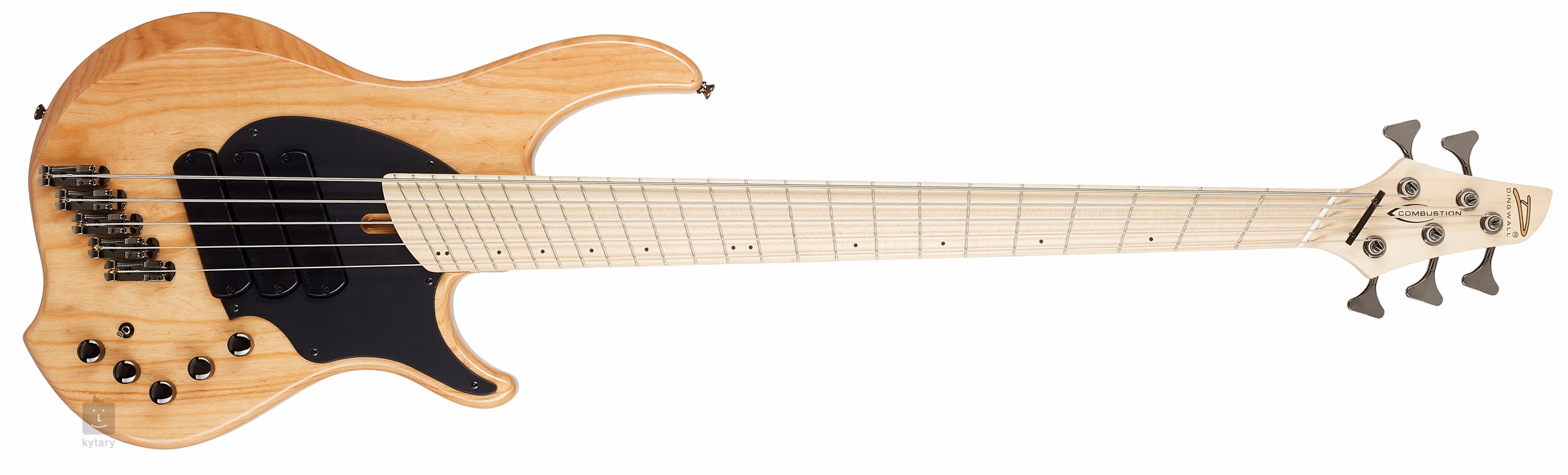 Pětistrunná baskytara značky Dingwall z řady Combustion v přirozeném barevném provedení Natural, jež dává vyniknout krásné kresbě jasanového dřeva.