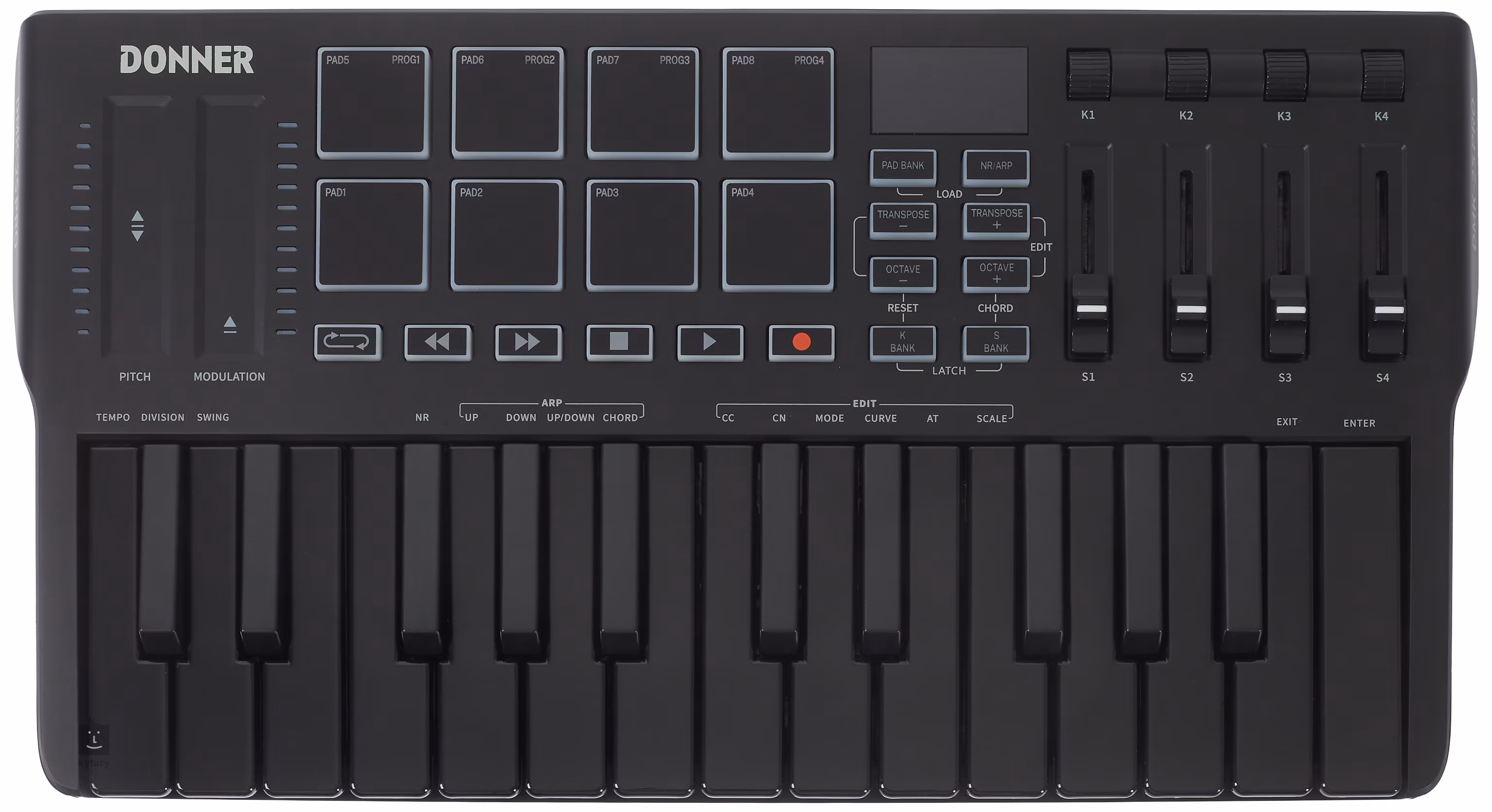 Donner DMK-25 je kompaktní MIDI keyboard s 25 klávesami, který otevírá cestu k tvorbě hudby v profesionální kvalitě, a přitom zůstává přístupný i začátečníkům. Díky inteligentnímu Dynamic Scale Mode lze snadno hrát basové linky, melodie i akordy – k dispozici je 16 ladění pro různé hudební žánry. K ještě větší flexibilitě slouží arpeggiátor, funkce note repeat a chord, které umožní rychle rozvíjet hudební nápady a improvizovat.