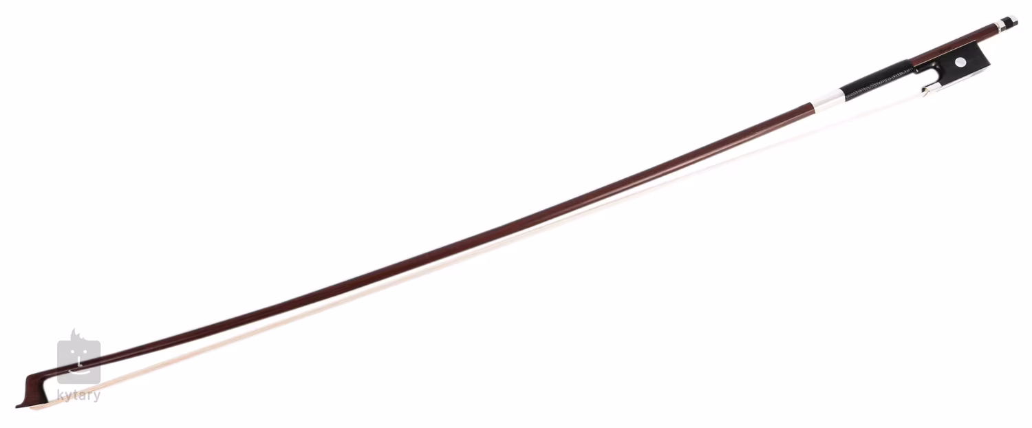 Houslový smyčec s kruhovým průřezem hůlky z brazilového dřeva má přírodní žíně, ebenovou žabku zdobenou očkem, drátěné vinutí a jednodílný napínací šroubek.