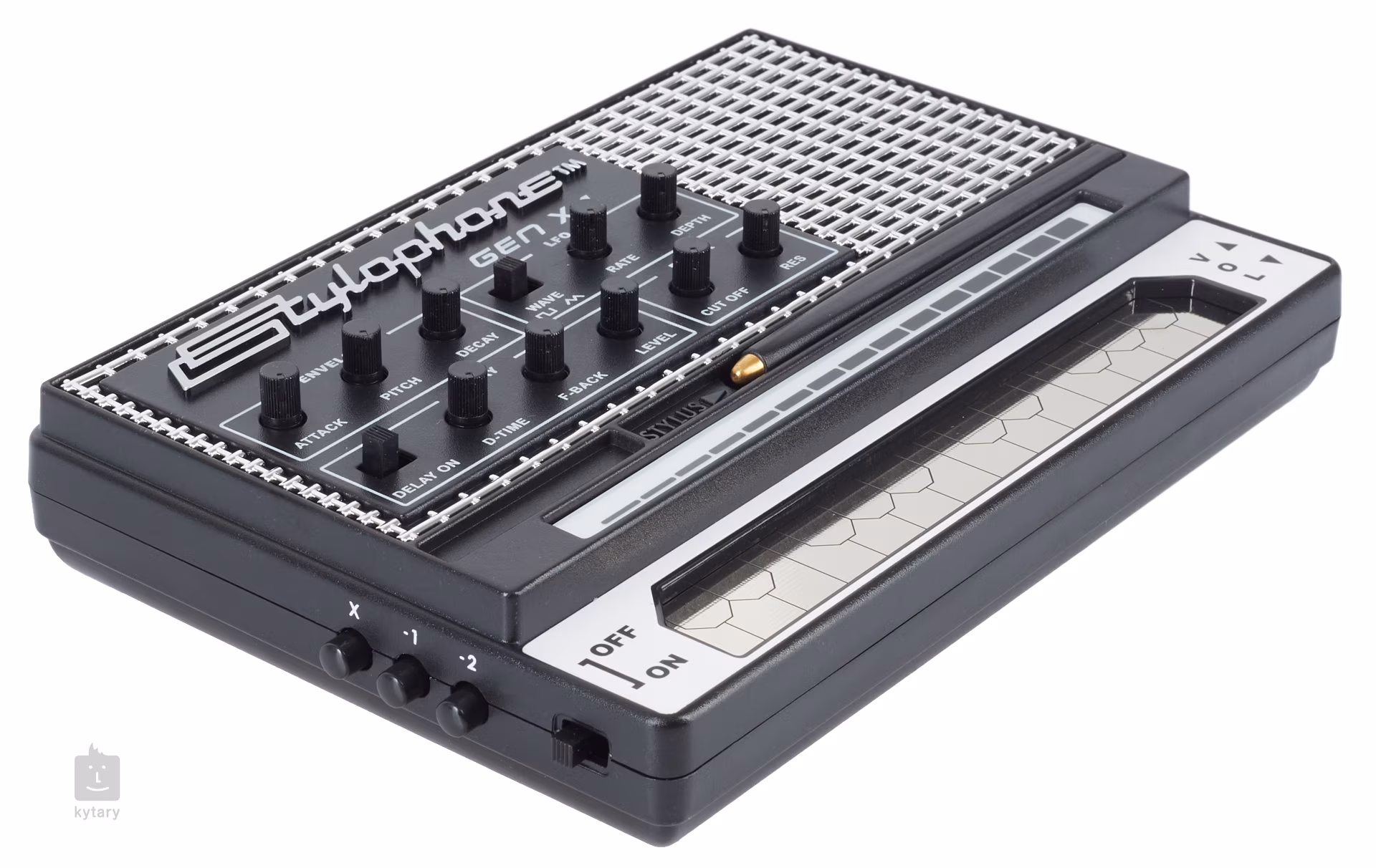 Stylophone je ikonický miniaturní syntezátor s vintage designem nabízející unikátní retro sound, který můžete znát z nahrávek Davida Bowieho nebo The White Stripes. Zvuk vytvoříte prostřednictvím jehly a ocelové vodivé lišty s 12 klávesami, přepínačem v rozsahu až tří oktáv a vibrato efektem. Stylophone X-1 dále disponuje LFO filtrem s dvěma křivkami, LP filtrem, envelope generátorem a v neposlední řadě Delay efektem. Samozřejmostí je potom vestavěný reproduktor s Volume ovladačem, sluchátkový výstup nebo AUX vstup pro propojení s dalšími syntezátory. Zařízení napájíte prostřednictvím čtyř AA baterií (nejsou součástí balení).