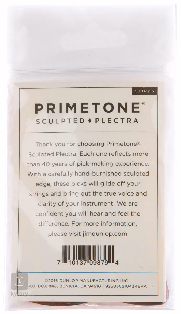Trsátka z řady Dunlop Primetone poskytují díky ručně broušenému zkosenému okraji nízký odpor při hraní, takže jsou schopna zvýšit vaši rychlost a zlepšit vám artikulaci. Zároveň jsou vyrobena z materiálu ultem, díky němuž poskytují přirozený zvuk a extrémní odolnost. Jejich povrch je opatřen jemným, protiskluzovým gripem pro pevný, neklouzavý úchop. Pokud hledáte trsátka, která jsou precizně zhotovena podle požadavků aktivních kytaristů, nemusíte hledat dál.