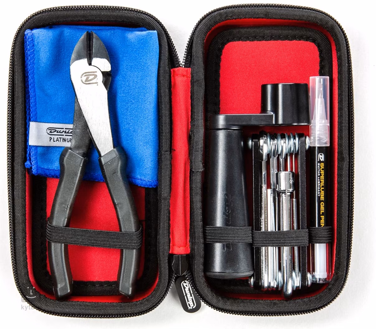 V tomto praktickém polyesterovém pouzdře naleznete vše, co potřebujete pro rychlou výměnu strun a seřízení Vaší kytary. Naleznete v něm kleště na struny, multifunkční kličku pro nastavení dohmatu na kobylce, kličku na struny a Superlube gel pro mazání nultého pražce. Pouzdro snadno uložíte do kapsy na příslušenství Vašeho kytarového obalu/kufru.
