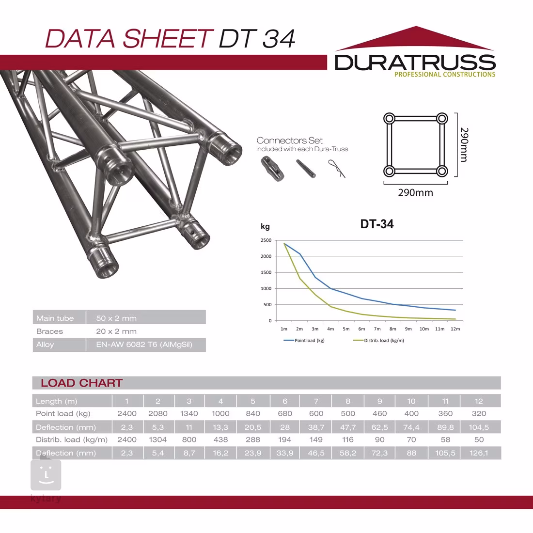 Konstrukce je součástí řady DT34, která nabízí širokou škálu modelů a příslušenství. K dispozici jsou rovné nosné konstrukce o různých délkách, spojky ve tvaru T a různé rohové díly. Kromě toho lze dokoupit bohaté montážní příslušenství. Tento systém evropské výroby je plně kompatibilní s většinou běžných systémů na trhu a pyšní se TÜV certifikací, což zajišťuje maximální spolehlivost a bezpečnost pro vaše pódia a osvětlení.