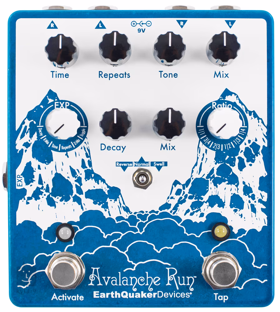 Třípolohovým přepínačem lze vybírat mezi třemi režimy efektů delay a reverb – je tady buď režim Normal pro standardní delay a reverb, Reverse pro reverzní delay a standardní reverb, nebo také Swell, který vytváří takzvaný swell efekt čili pozvolný náběh hlasitosti. Pomocí ovladače Ratio můžete ovlivnit frázování funkce Tap Tempo a to v hodnotách čtvrtin, osmin s tečkou, čtvrtinových triol, osmin, osminových triol a šestnáctin. Přepínačem EXP pak jednoduše nastavíte, který parametr bude ovládat externí expression pedál. Avalanche Run V2 disponuje také technologií Flexi-Switch, která nabízí kromě klasického latch on/off režimu i funkci momentary, při jejímž použití bude efekt aktivní pouze po dobu stisknutí footswitche. Veškerá elektronika je zasazena v bytelném kovovém šasi. K napájení slouží 9V adaptér, který je součástí balení.