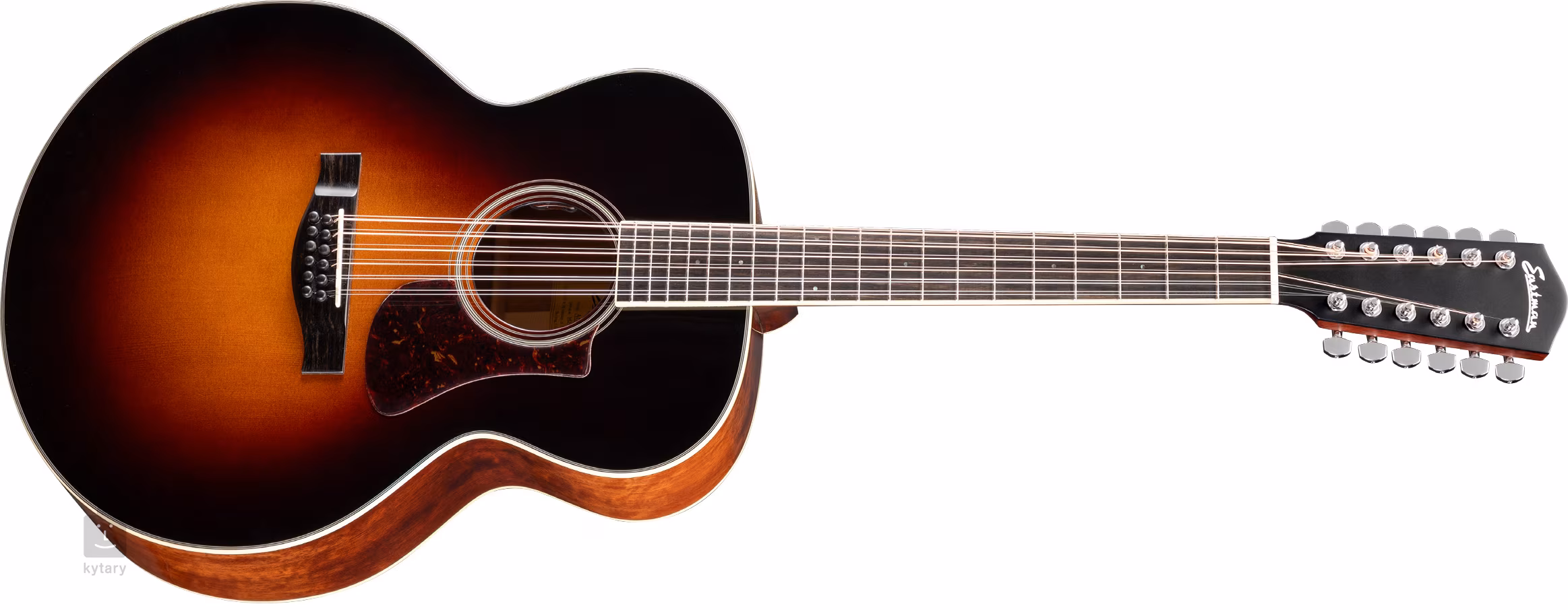 Eastman AC330E-12 Sunburst je celomasivní dvanáctistrunná elektroakustická kytara s velkým rezonantním tělem typu Jumbo. Přední deska kytary je zhotovena ze smrku Sitka, zadní deska a luby jsou vyrobeny z mahagonu. K mahagonovému krku s příjemným “C” profilem je přilepen ebenový hmatník osazený dvaceti pražci. Rezonanci topu podporuje ručně snížené žebrování (Scalloped X), orientaci na hmatníku usnadňují perleťové poziční tečky.
