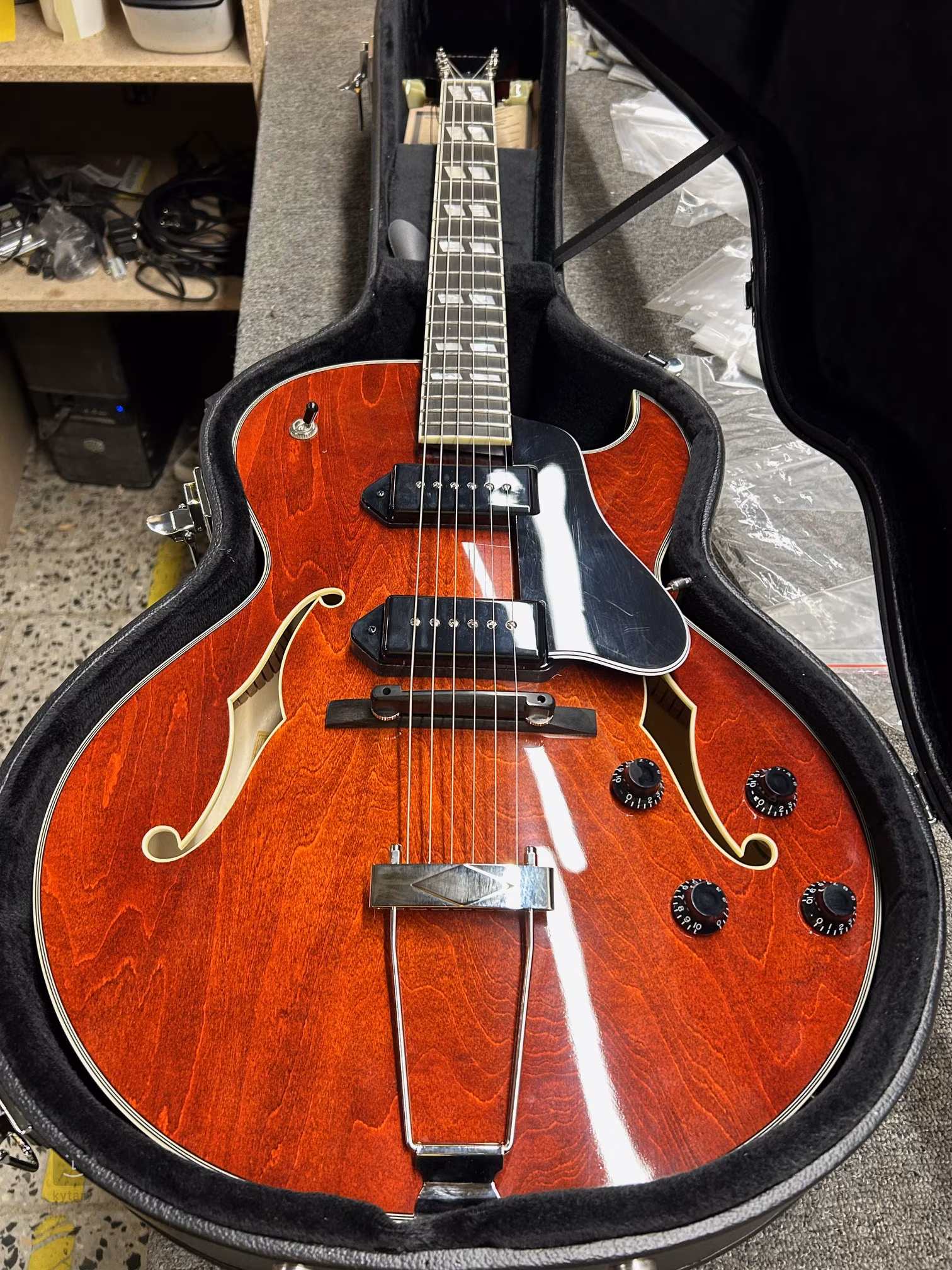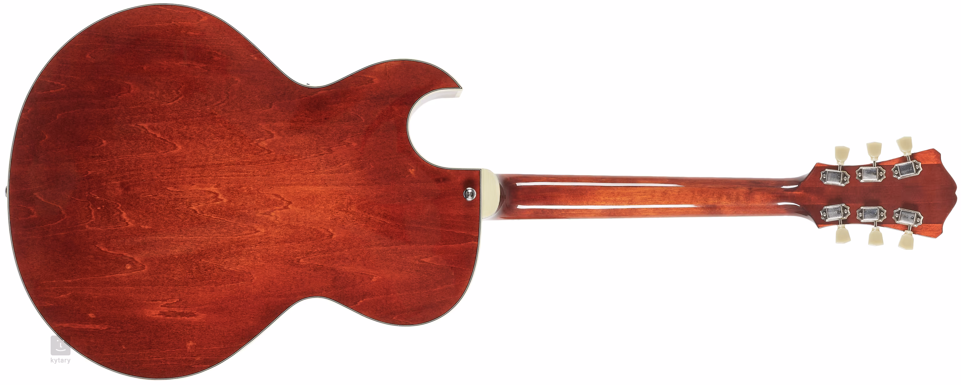O ozvučení nástroje se starají dva Tonerider Dogear P-90 snímače v dogear designu. Charakter zvuku upravíte pomocí standardních ovladačů. Struny jsou uchyceny v ladicích mechanikách Pingwell a přes nastavitelnou palisandrovou kobylku v chromovaném struníku (Trapeze Style). Pěkné zpracování podtrhuje oboustranná lemovka těla, hmatníku a F otvorů z imitace slonoviny, černý lemovaný pickguard a perleťové firemní logo na hlavici.