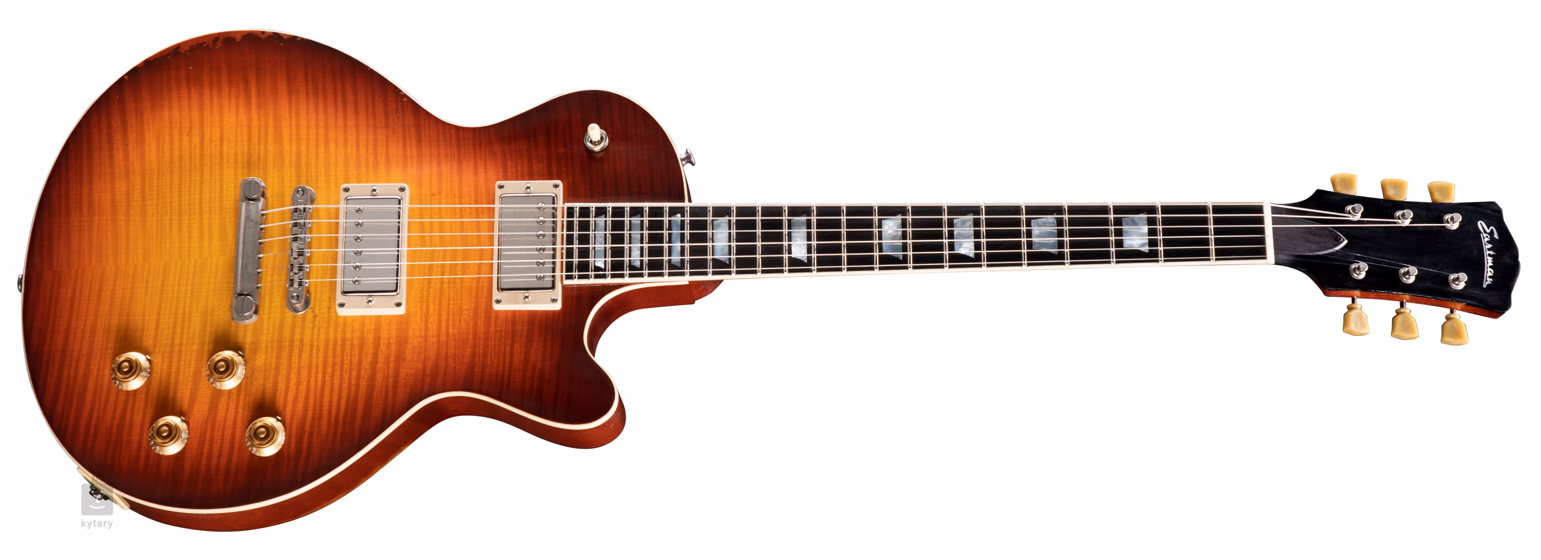 Dva humbuckery Lollar Custom Aged/Wound Imperial poskytují kytaře čistý vřelý a dynamický zvuk 1950s PAF snímačů, který vynikne v rocku, bluesu a celé škále dalších hudebních žánrů. Charakter zvuku upravíte pomocí standardních ovladačů. Struny jsou uchyceny v ladicích mechanikách Gotoh a přes kobylku Gotoh GE-104B-NI Relic ve struníku téže značky. Pěkné zpracování podtrhuje lemovka topu a hmatníku z imitace slonoviny, hardware s jemnými prvky patiny (Antique Nickel) a perleťové firemní logo na hlavici.