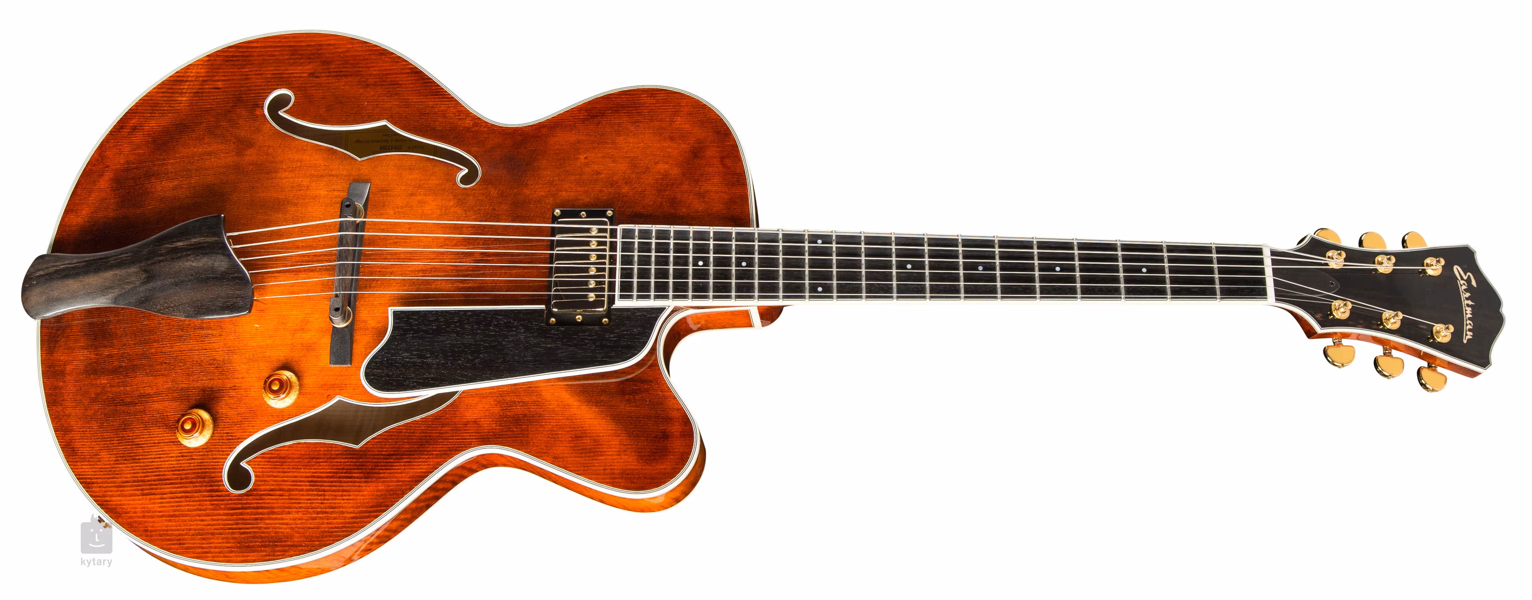 Krkový zakázkově vinutý humbucker Lollar Custom Wound Imperial poskytuje kytaře čistý vřelý a dynamický zvuk 1950s PAF snímačů, který vynikne v jazzu i blues. Charakter zvuku upravíte pomocí standardních ovladačů. Struny jsou uchyceny v ladicích mechanikách renomované značky Gotoh a přes nastavitelnou ebenovou kobylku ve struníku (mosaz/eben). Pěkné zpracování podtrhuje obvodová lemovka těla, hmatníku a hlavice z imitace slonoviny, lemovaný ebenový pickguard, hardware ve zlatém provedení a perleťové firemní logo na hlavici.