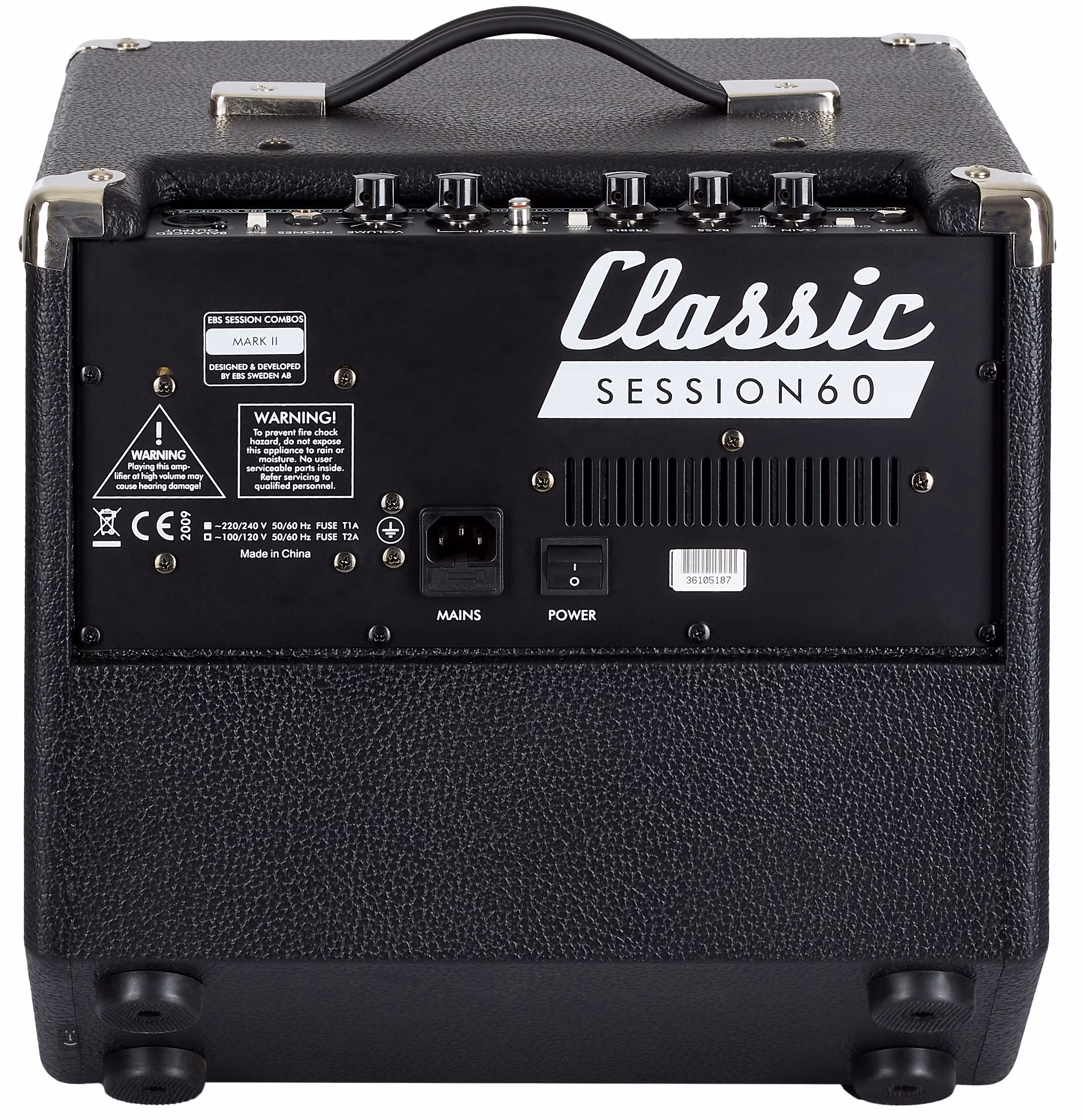 Kombo EBS Session 60 osazené desetipalcovým reproduktorem a tweeterem má kontrolní panel vybavený ovladači vstupního signálu (Gain), dvoupásmovým ekvalizérem (Bass, Treble) a potenciometrem hlasitosti (Volume). Svůj vlastní tón si můžete konkrétněji nadefinovat pomocí přepínačů Character a Enhance. Vstup pro externí audio signál a sluchátkový výstup kombo předurčují i k domácímu cvičení nebo rozehrání před koncertem. XLR výstup je ideální pro domácí nebo studiové nahrávání, stejně tak jako pro výstup do mixážního pultu. Reproduktor chrání mřížka a hrany komba zpevňují kovové pláty. Pro lepší odposlech je zadní strana boxu zkosená, takže jej lze naklonit.