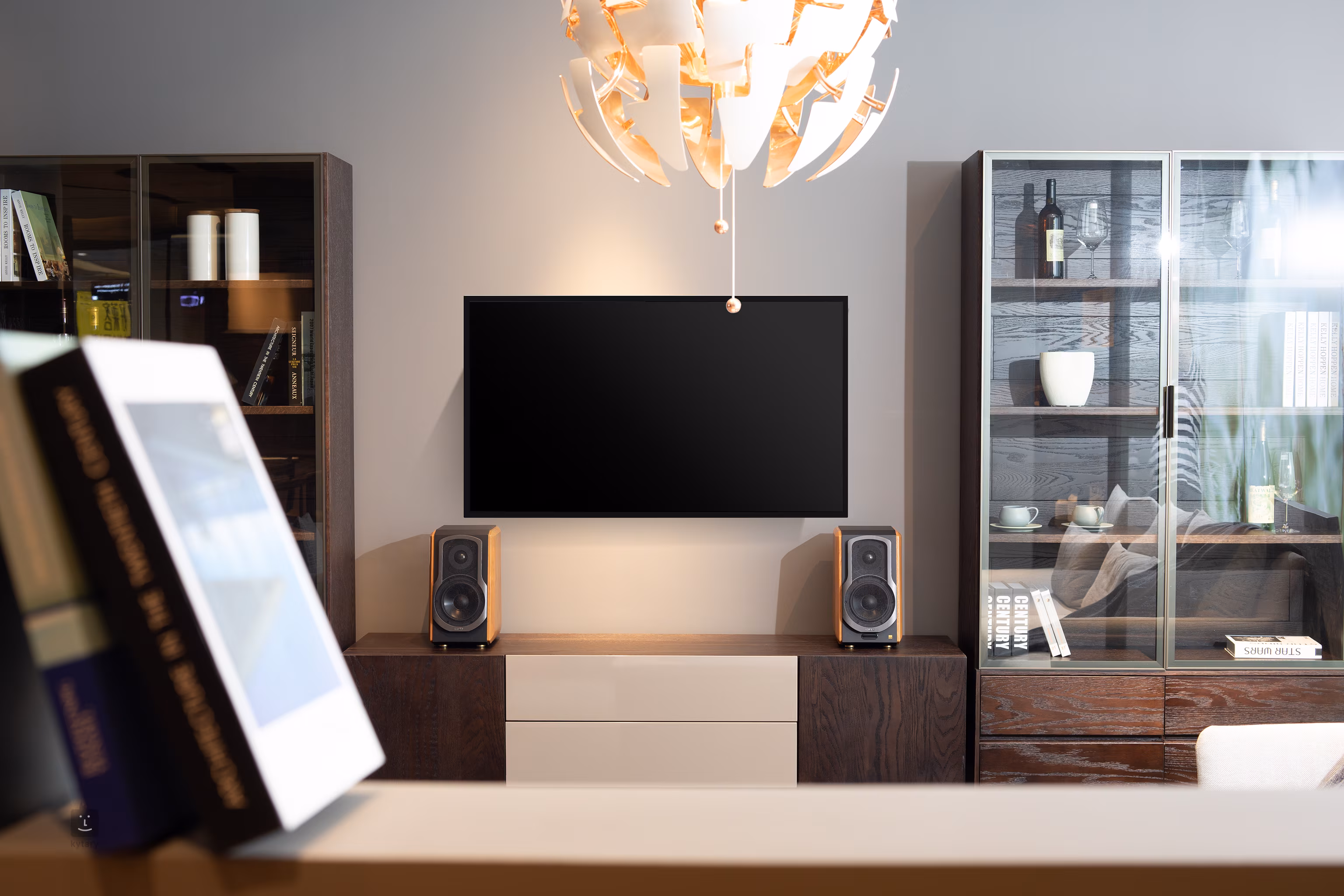 Nižší rezonance Kvalitní dřevěná skříň minimalizuje akustickou rezonanci a dále snižuje zkreslení. Nakloněný přední panel umožňuje měničům směřovat zvuk přímo k vašim uším.