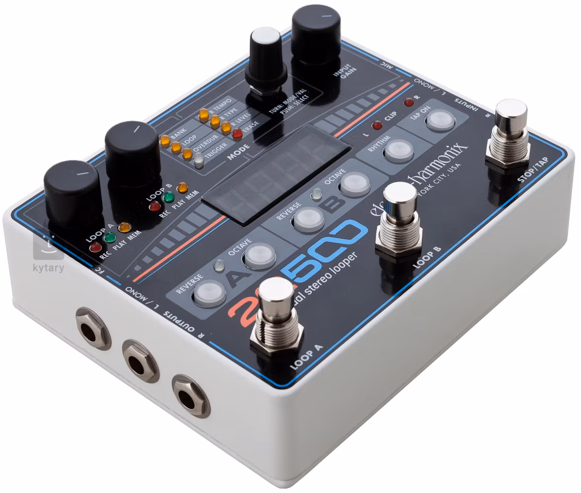 Electro-Harmonix 22500 je duální stereo looper se dvěma nezávislými smyčkami, které lze přehrávat současně a to buď v paralelním nebo sériovém režimu. Díky tomu je můžete buďto vrstvit a přehrávat tak například vokální a instrumentální smyčky současně, nebo je využít na střídání různých částí skladby, třeba sloky a refrénu. Součástí výbavy je také 16 bicích doprovodů, které se vám budou hodit pro vytříbení vašeho rytmického citu a dva loopingové efekty – pomocí Reverse budete moci obrátit nahranou smyčku, aby hrála pozpátku a Octave vám umožní zpomalit nebo zrychlit smyčku a tím ji zvýšit či snížit o oktávu. Krabička nahrává kvalitní nekomprimovaný zvuk, který věrně zachytí zvuk vaší kytary.