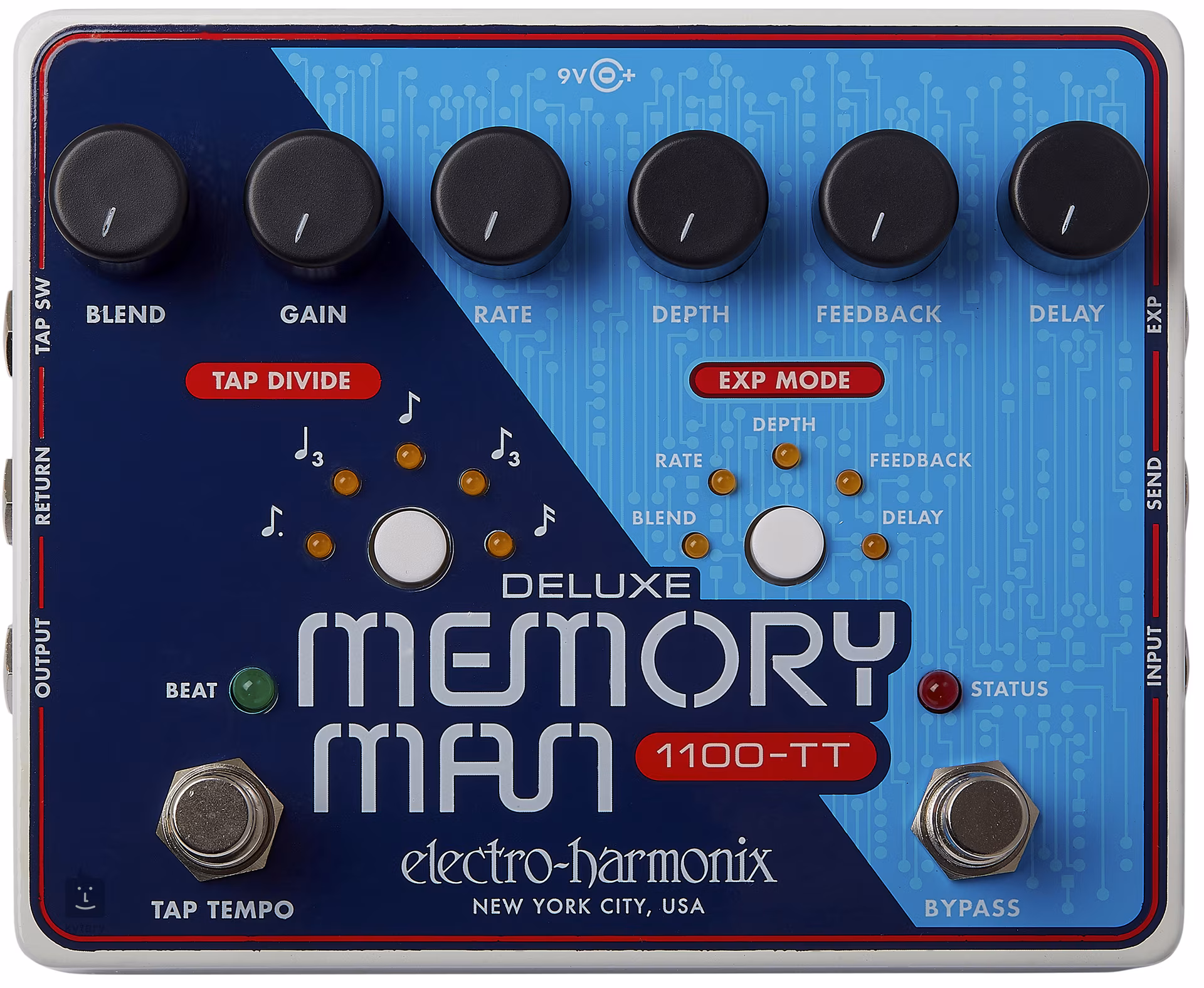 Kytarový efekt Deluxe Memory Man 1100-TT od americké značky Electro-Harmonix (EHX) je rozšířenou verzí legendárního analogového delaye, jehož vřelý organický zvuk provází muzikanty již více než 30 let. Tato novější verze vylepšuje originál přidáním v současnosti velmi populárních a žádaných funkcí, tj. Tap Tempa s ovládáním samostatným footswitchem, vstupu pro expression pedál a interní efektové smyčky.