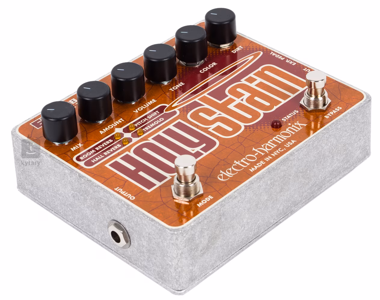 K čemu tento efekt slouží, je asi zcela jasné – jde vlastně o multiefekt, který zastoupí efekty typu distortion (Holy Stain je tvoří analogově, umí klasicky čistý zvuk, Ovedrive s pěkným hladkým zkreslením a pořádně „chlupatý“ Fuzz), a digitální efekty typu Tremolo (efekt periodicky mění nahoru a dolů hlasitost Vašeho signálu), Reverb (ke zvuku je přidána jeho ozvěna, výsledkem je zvuk jako byste hráli v místnosti s výraznou akustikou) a Pitch Shifter (umí posunout ladění až o velkou tercii nahoru nebo o kvartu dolů)