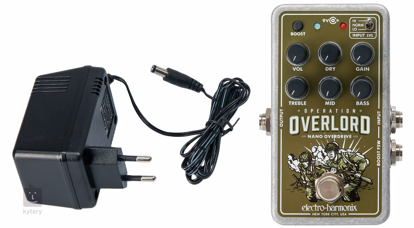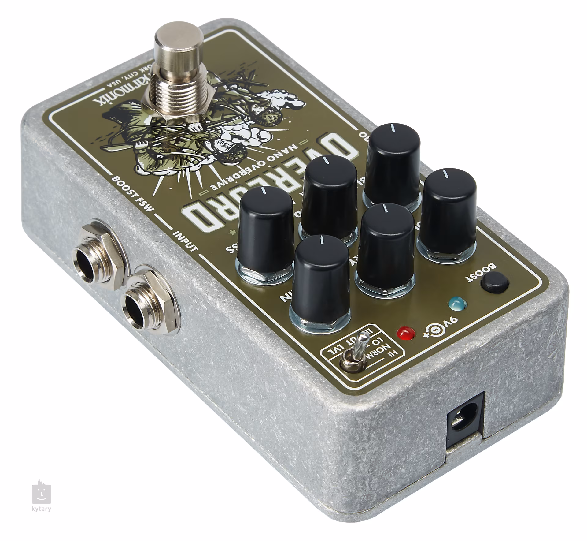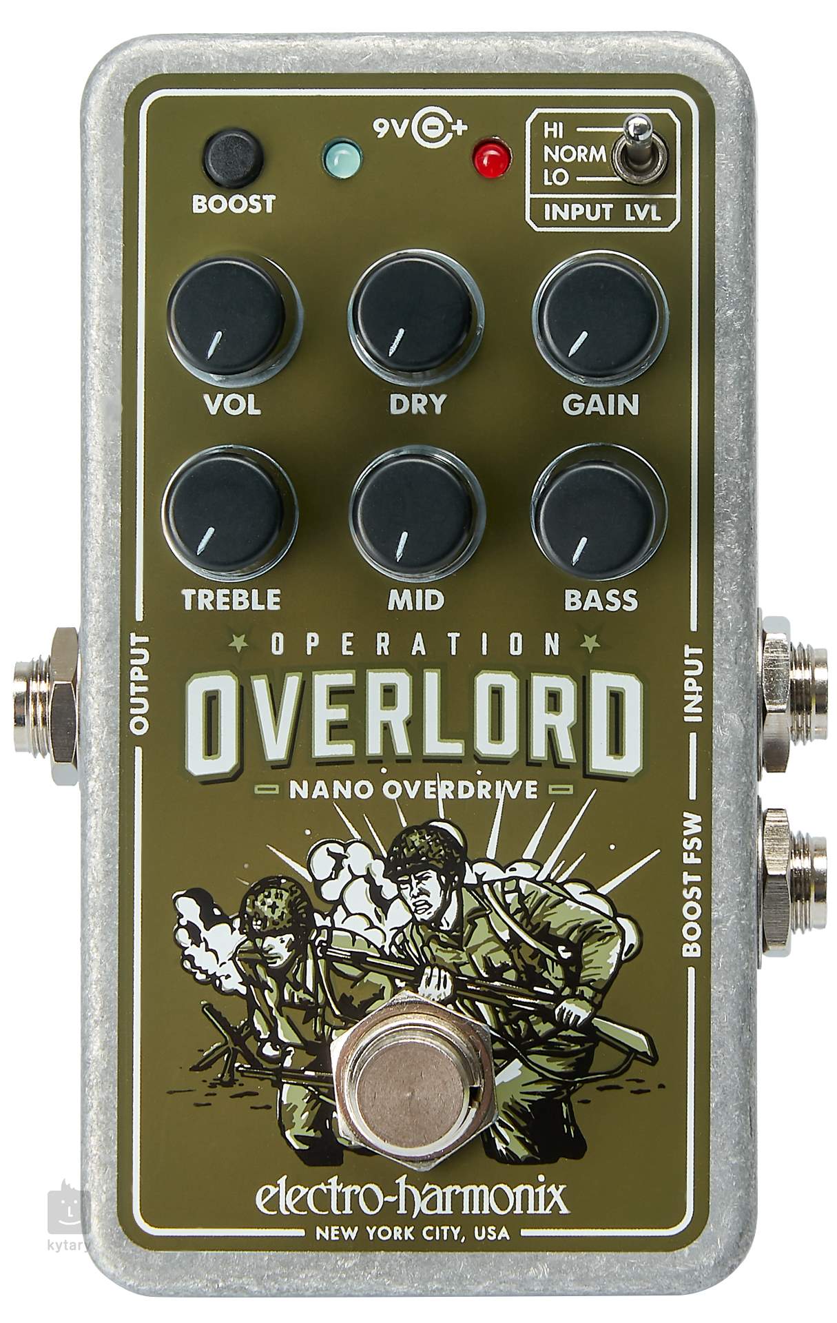 Nano Operation Overlord je kompaktní overdrive od firmy EHX, který bez potíží vměstnáte do vašeho pedalboardu. Krabička nabízí tradiční ovládací prvky v podobě aktivního třípásmového ekvalizéru a potenciometrů určujících hlasitost, míru zkreslení/gainu a poměru dry/wet signálu. Kromě standardního režimu s možností low až mid gain nastavení zvuku lze aktivovat (tlačítkem na pedálu nebo pomocí externího footswitche – není součástí balení) režim Boost, kdy přidáte do signálové cesty (před JFET) klasický overdrive obvod pro dosažení většího zkreslení/distortionu. Díky možnosti nastavit sílu vstupního signálu třípolohovým switchem (Hi, Norm, Lo) je pedál navíc vhodný nejen pro elektrickou kytaru, ale i baskytaru nebo klávesové nástroje.